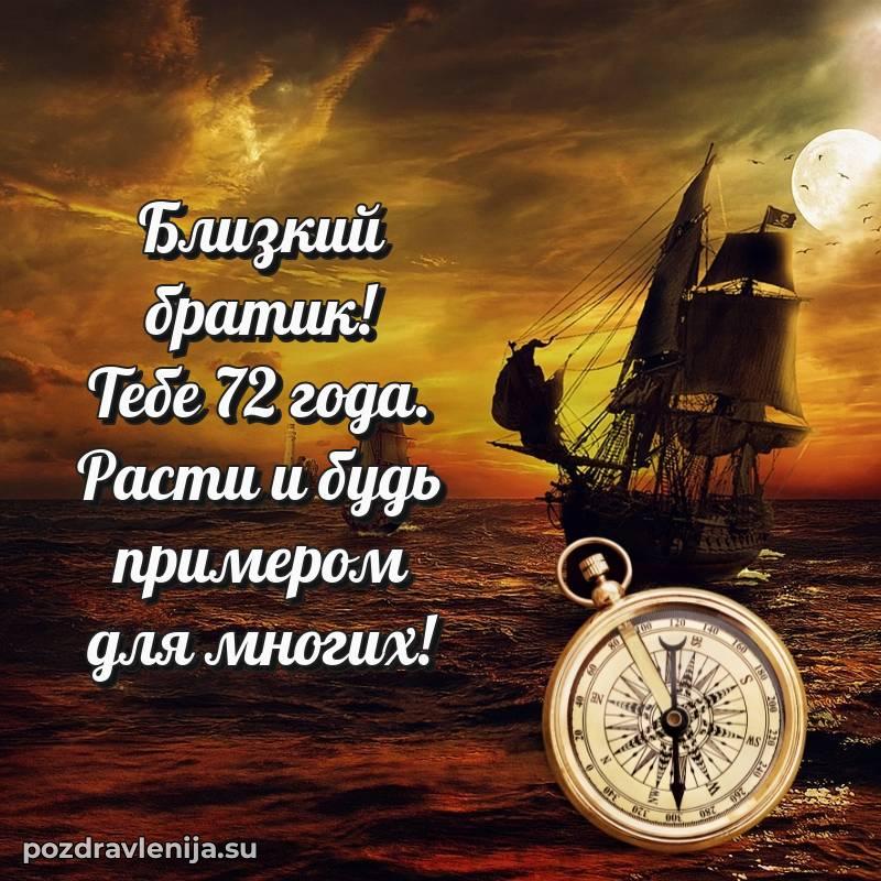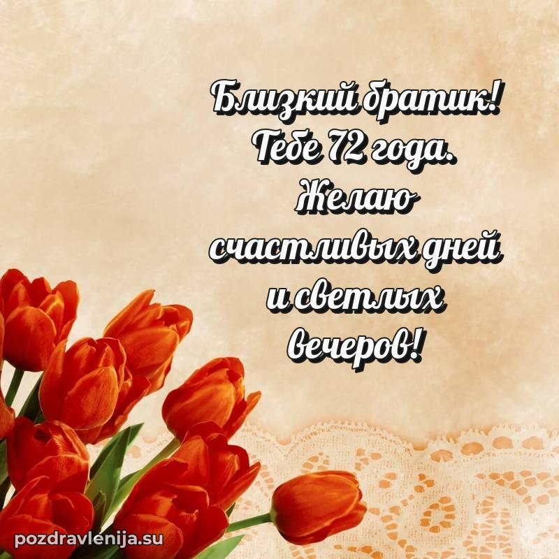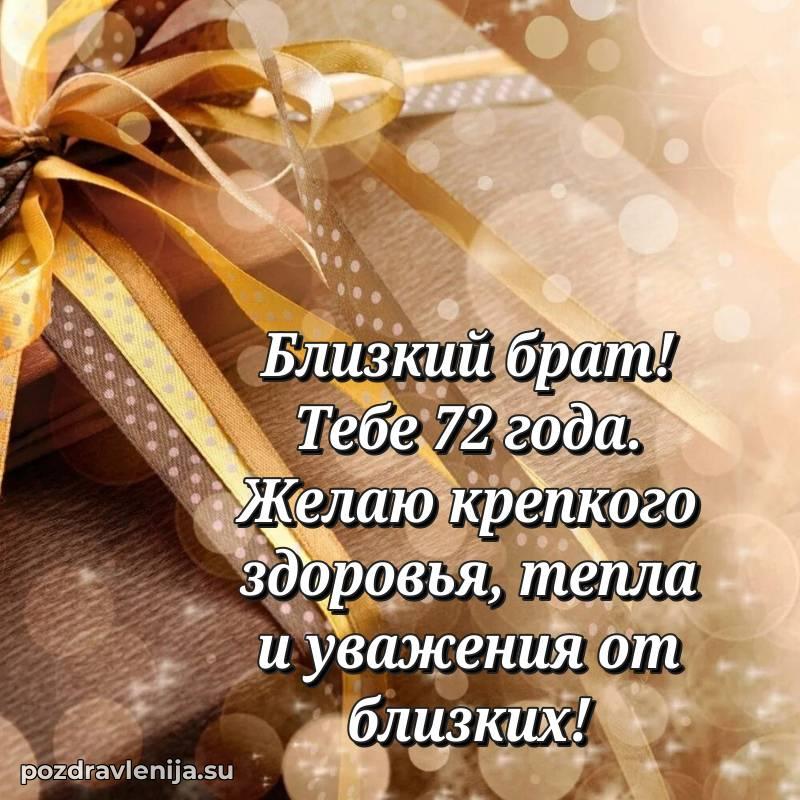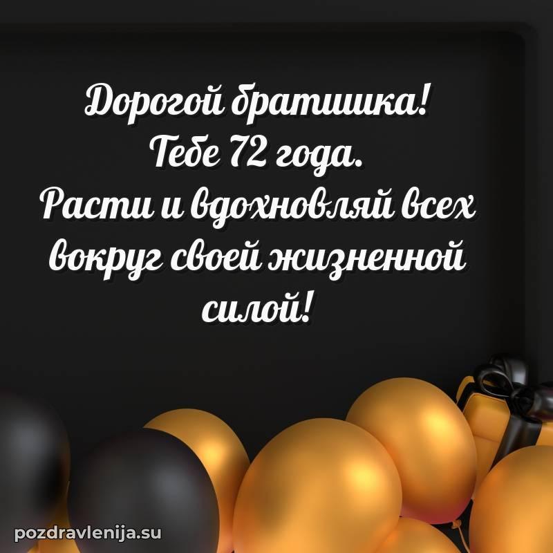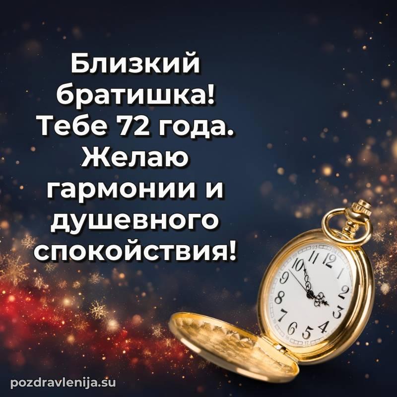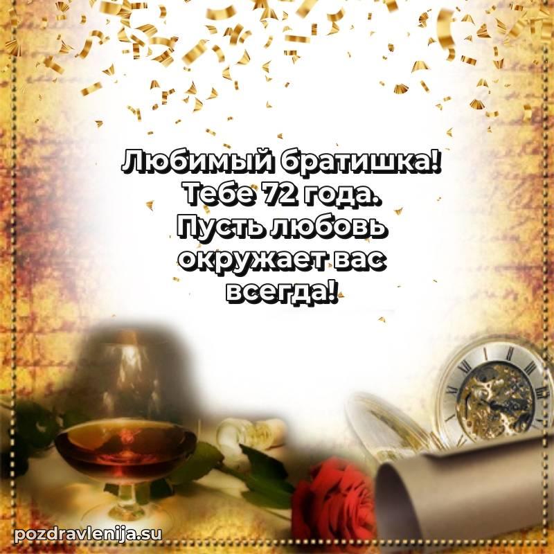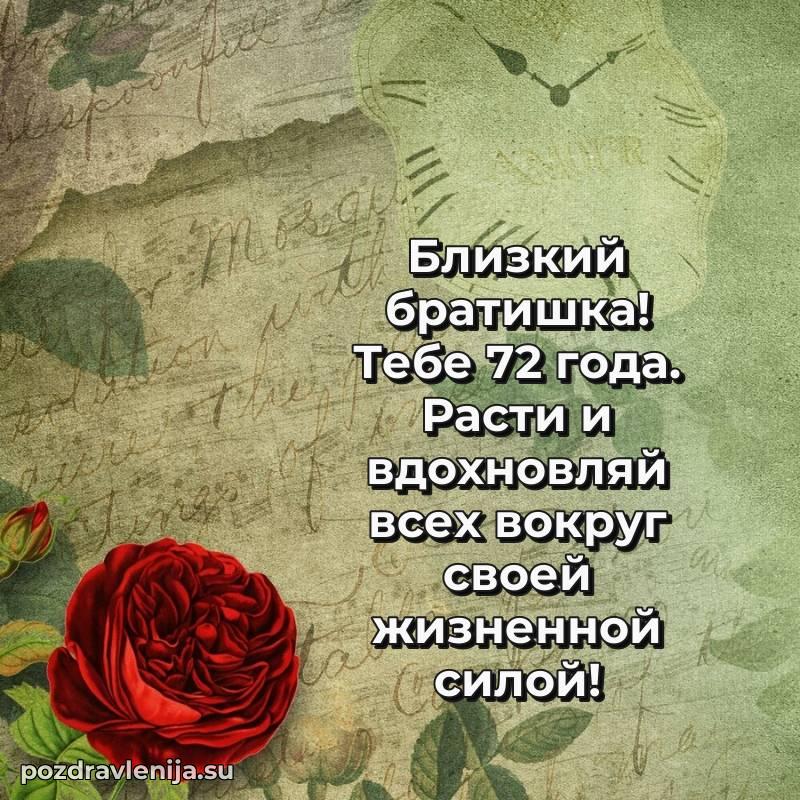 С наступлением 72 года, брат! Пусть этот возраст принесет мудрость, покой и много приятных моментов. Оставайся таким же сильным и прекрасным человеком!