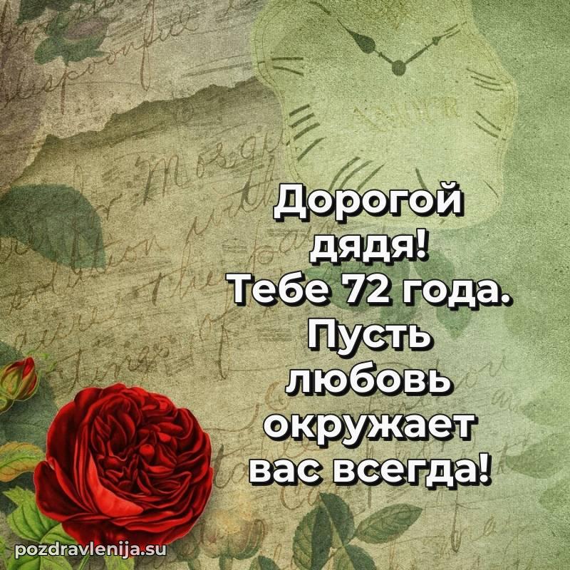 У нас вы найдете широкий выбор красивых и оригинальных поздравлений Дяде на 72 года с Днем Рождения, составленных с душой и вниманием к деталям. В данном разделе представлены поздравления как в стихах, способные вызвать улыбку и радость, так и трогательные поздравления в прозе, исполненные своими словами.