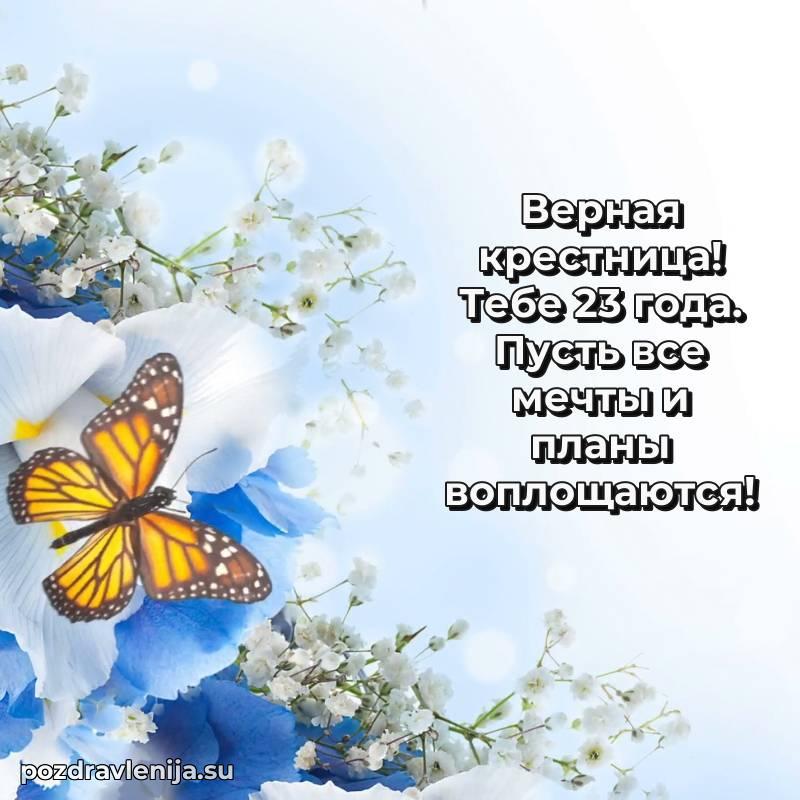С днём рождения, милая крёстница! Тебе 23 года, и ты с каждым годом становишься только краше. Твоя энергия и улыбка наполняют нас радостью. Желаем тебе здоровья, чтобы всё в жизни складывалось наилучшим образом. Пусть каждый момент приносит счастье, а трудности обходят стороной. Оставайся такой же замечательной, а мы будем рядом, поддерживая тебя во всём!