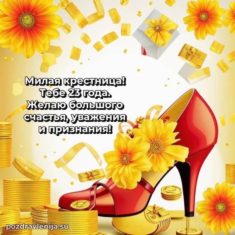 Крёстница милая, с днём рождения! В твои 23 года ты сияешь красотой и добротой. Ты – наше сокровище, и мы счастливы быть частью твоей жизни. Желаем тебе крепкого здоровья, чтобы ты всегда была полна энергии. Пусть жизнь радует приятными моментами, а трудности обходят стороной. Оставайся такой же светлой и нежной, а любовь семьи согревает тебя каждый миг!