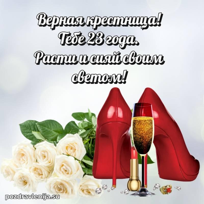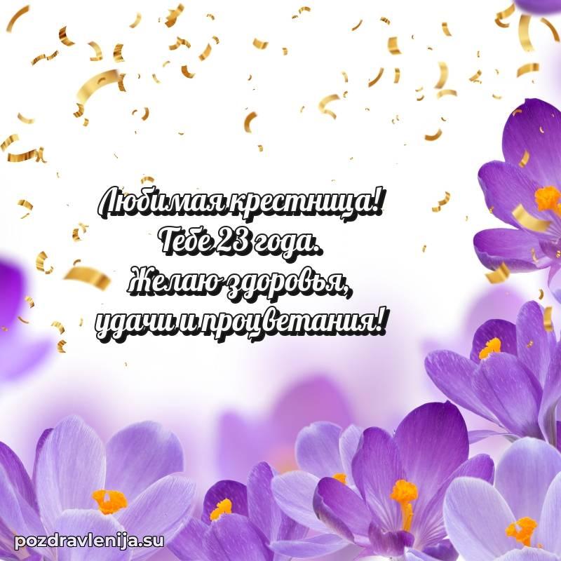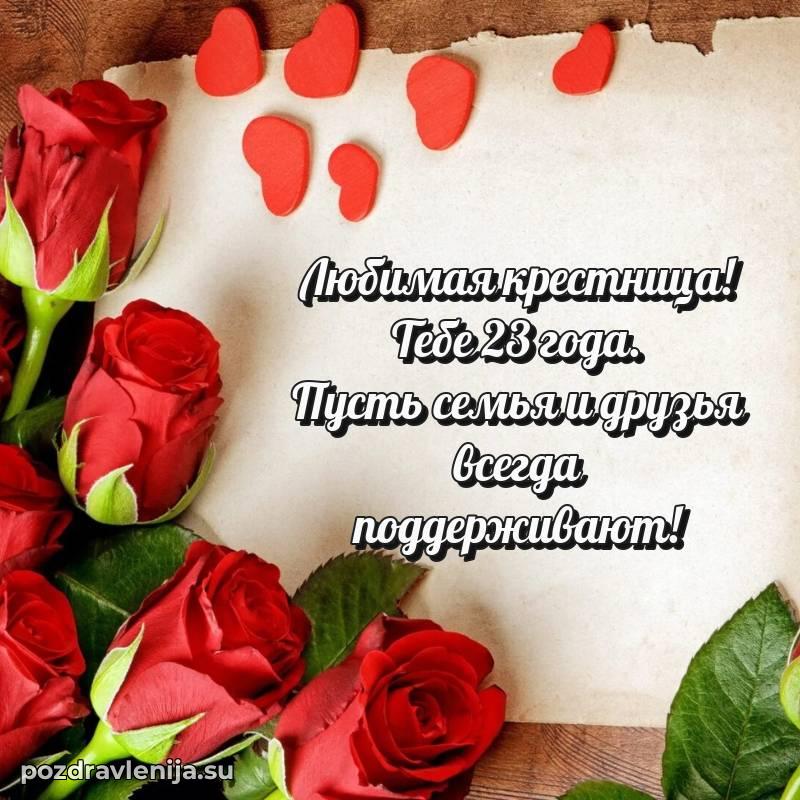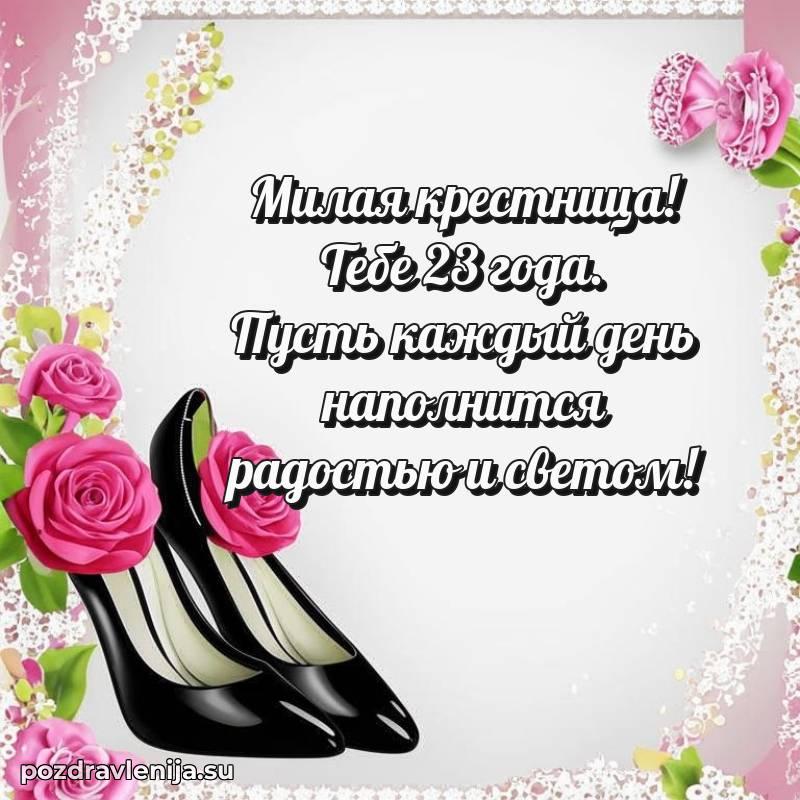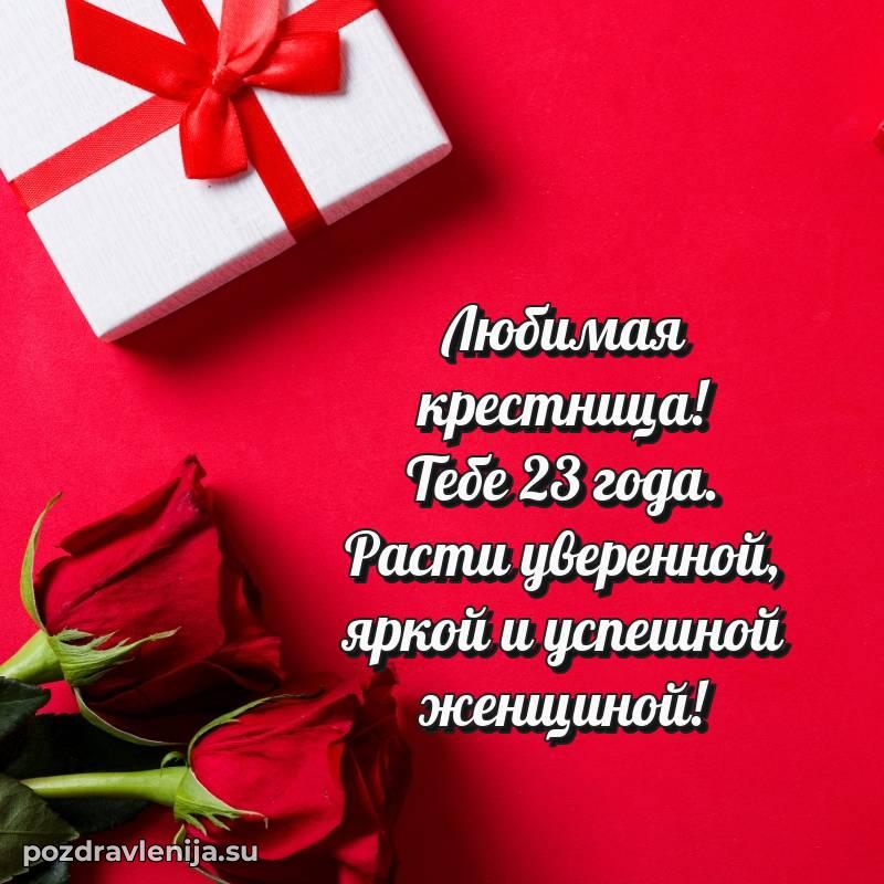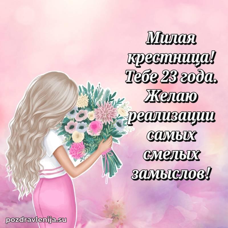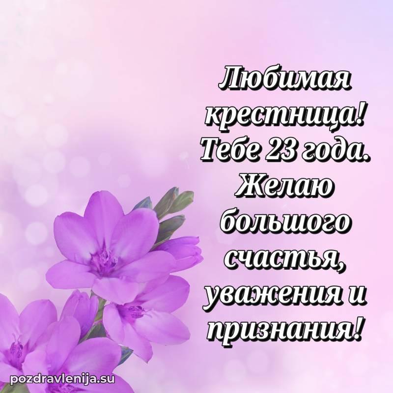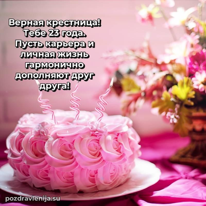 С днём рождения, милая крёстница! В твои 23 года ты – воплощение красоты и нежности. Ты приносишь столько радости в нашу жизнь, что мы не перестаём восхищаться тобой. Желаем тебе крепкого здоровья, чтобы ты могла осуществить все свои мечты. Пусть жизнь будет полна счастья, а заботы уходят прочь. Оставайся такой же доброй, а любовь близких окружает тебя!