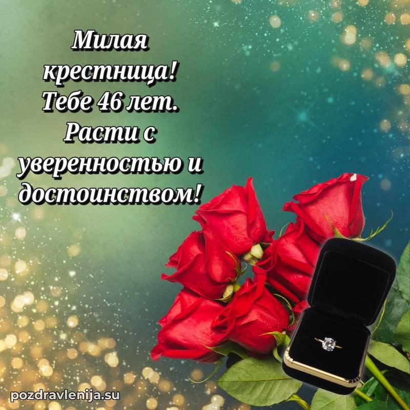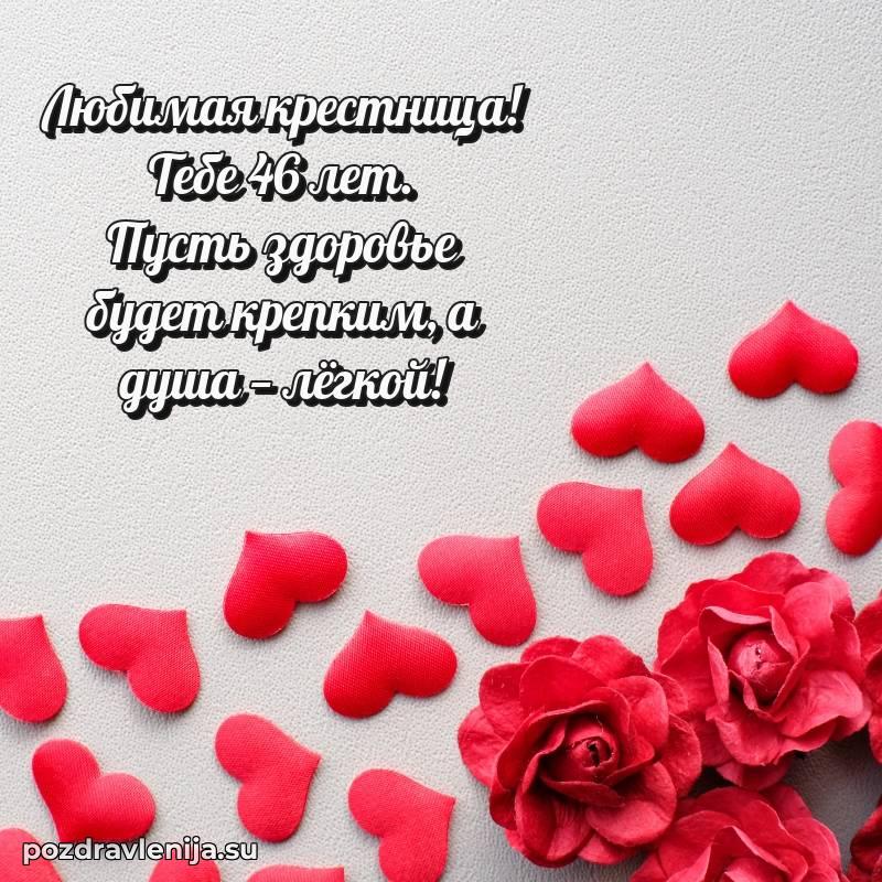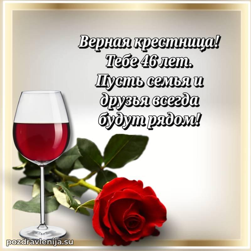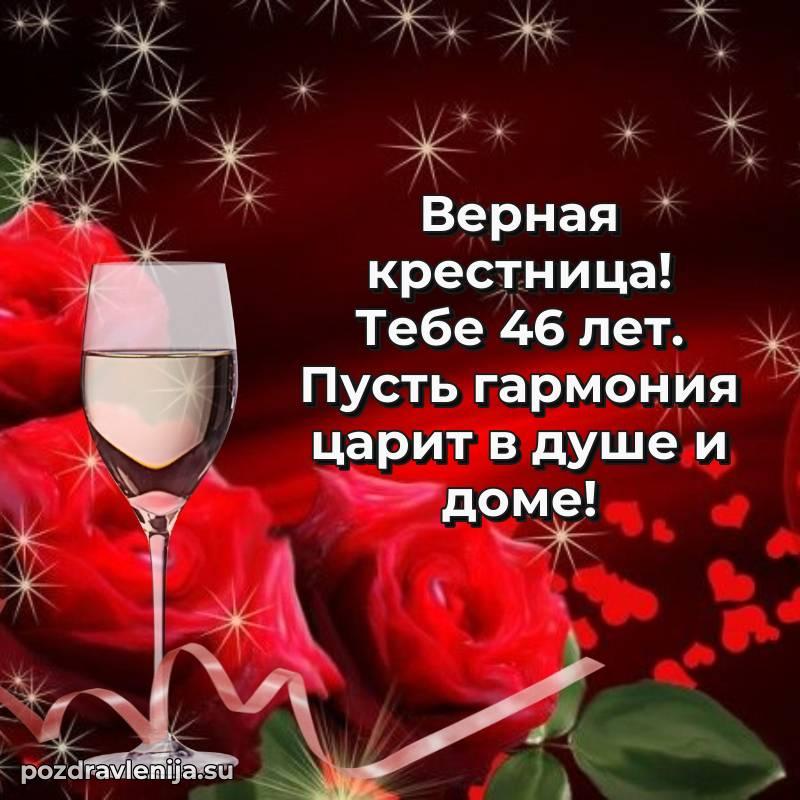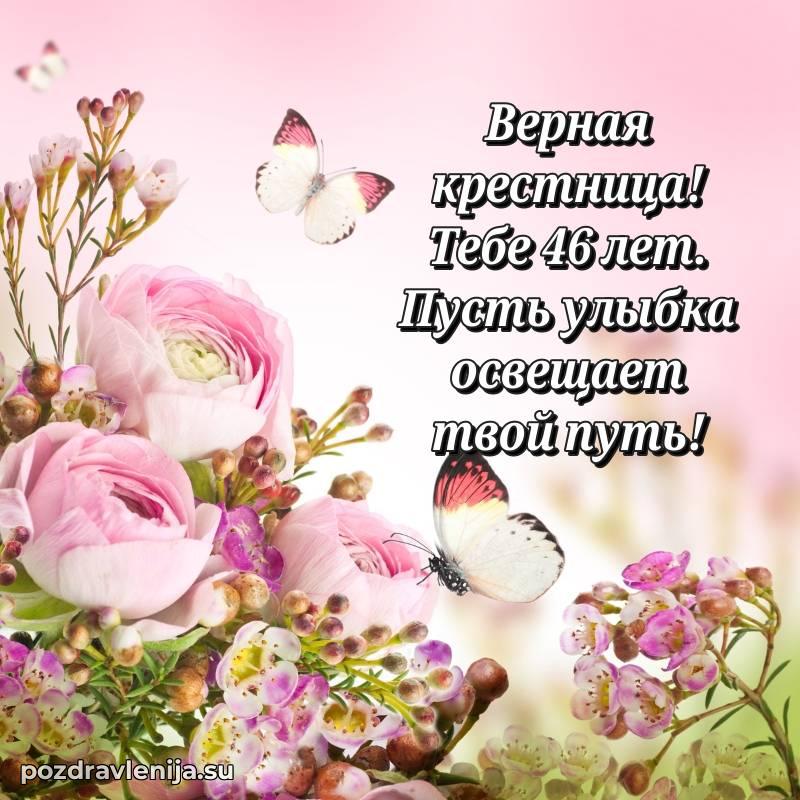 С днём рождения, милая крёстница! В твои 46 лет ты – воплощение красоты и нежности. Ты приносишь столько радости в нашу жизнь, что мы не перестаём восхищаться тобой. Желаем тебе крепкого здоровья, чтобы ты могла осуществить все свои мечты. Пусть жизнь будет полна счастья, а заботы уходят прочь. Оставайся такой же доброй, а любовь близких окружает тебя!