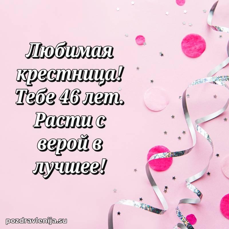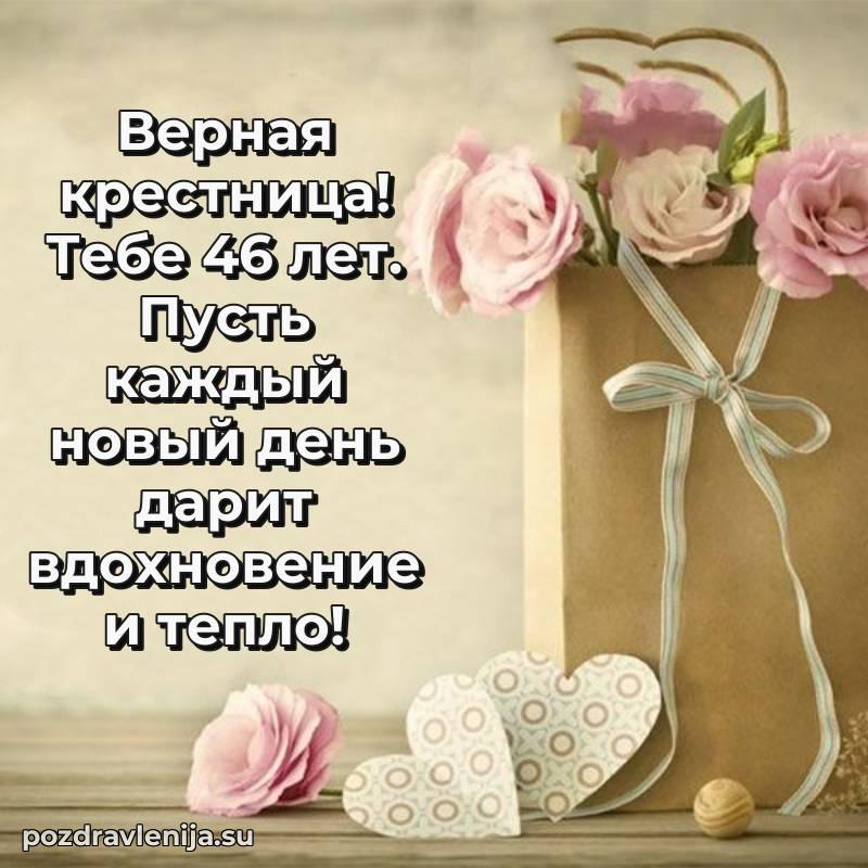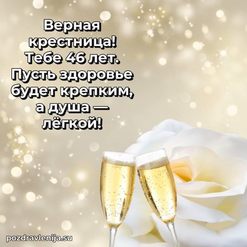 С днём рождения, дорогая крёстница! В твои 46 лет ты – воплощение нежности. Ты приносишь столько радости, что мы не перестаём благодарить судьбу за тебя. Желаем тебе крепкого здоровья, чтобы ты могла наслаждаться жизнью. Пусть каждый день приносит смех и радость, а заботы обходят стороной. Оставайся такой же светлой и искренней, а мы всегда будем рядом!