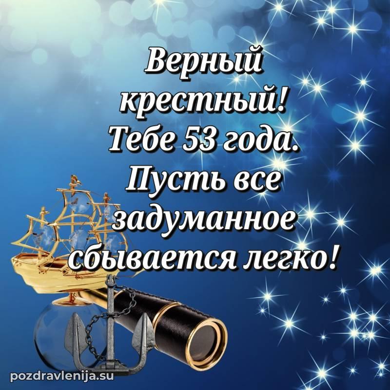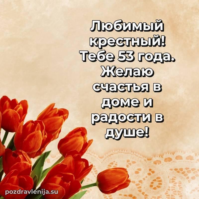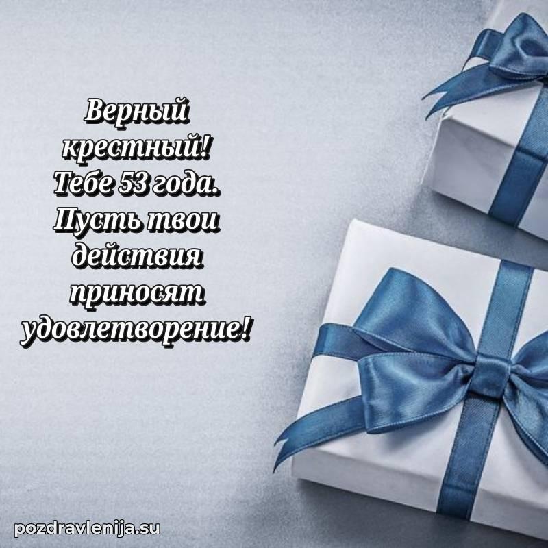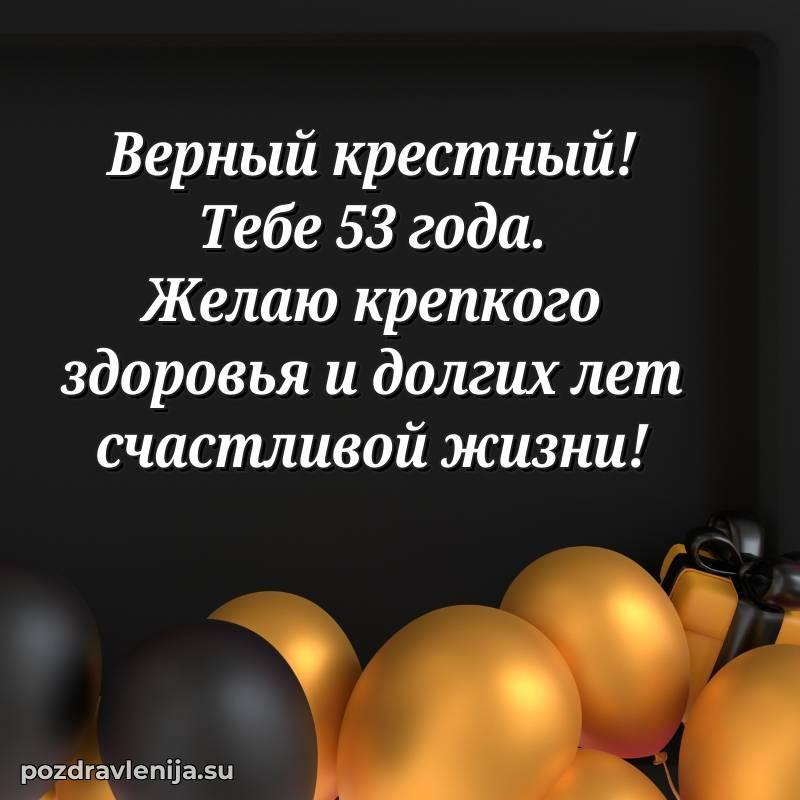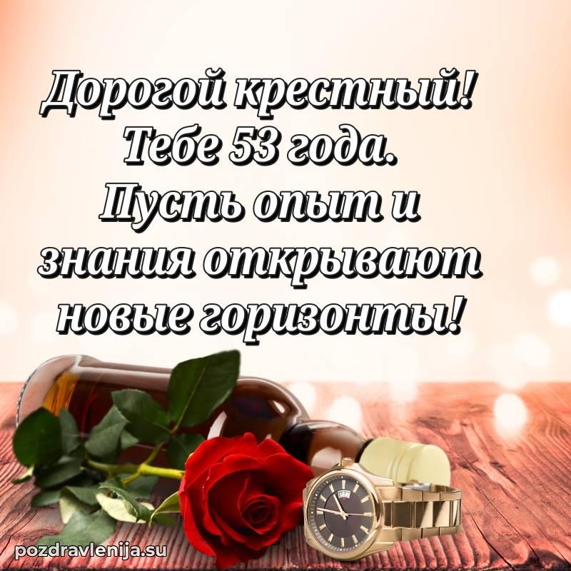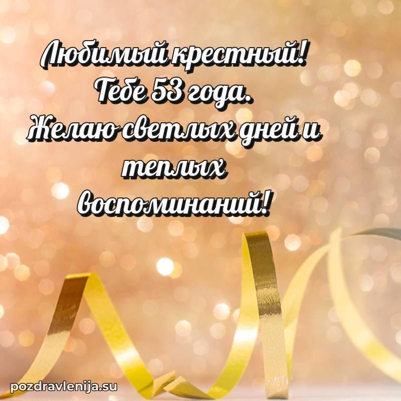 Крёстный, с праздником Вас! В Ваши 53 года Вы сияете ярче всех. Желаем Вам крепкого здоровья, радости в сердце и чтобы жизнь была наполнена теплом близких. Спасибо за Вашу доброту!