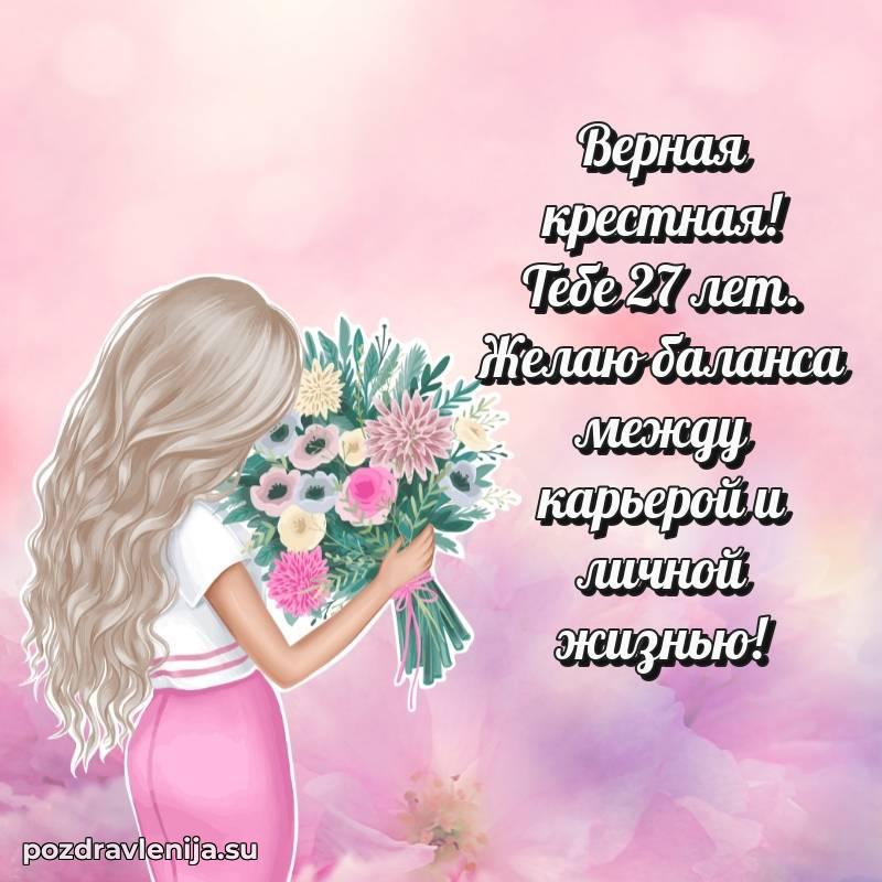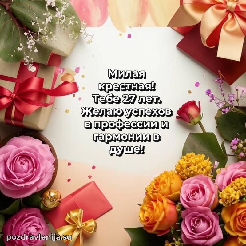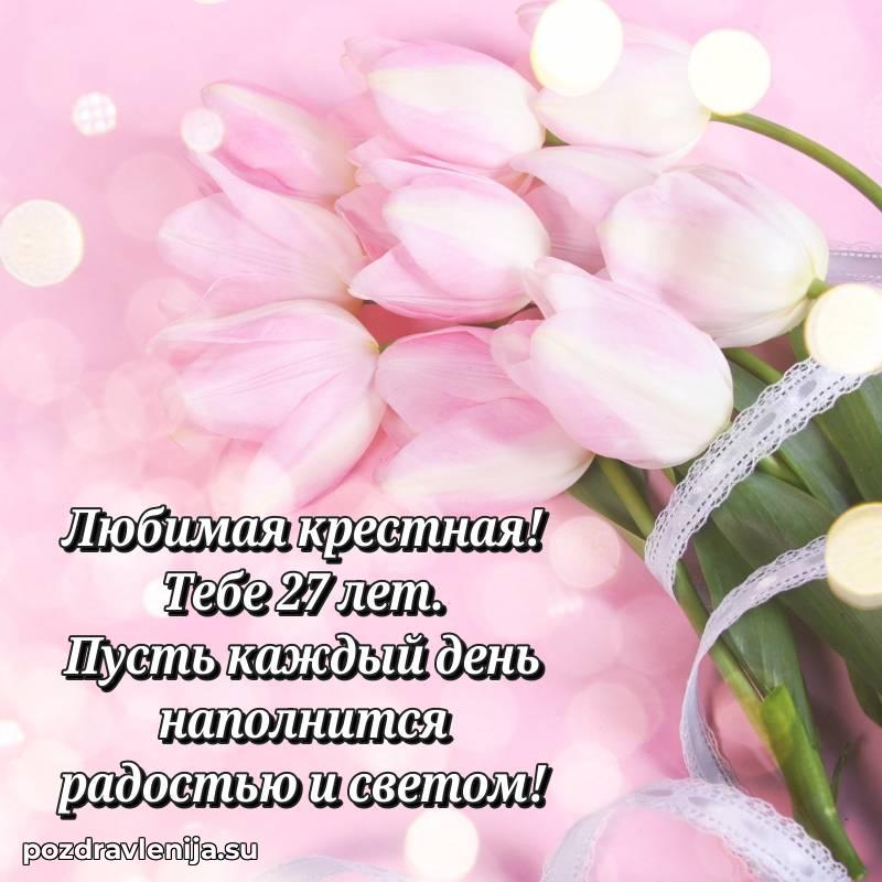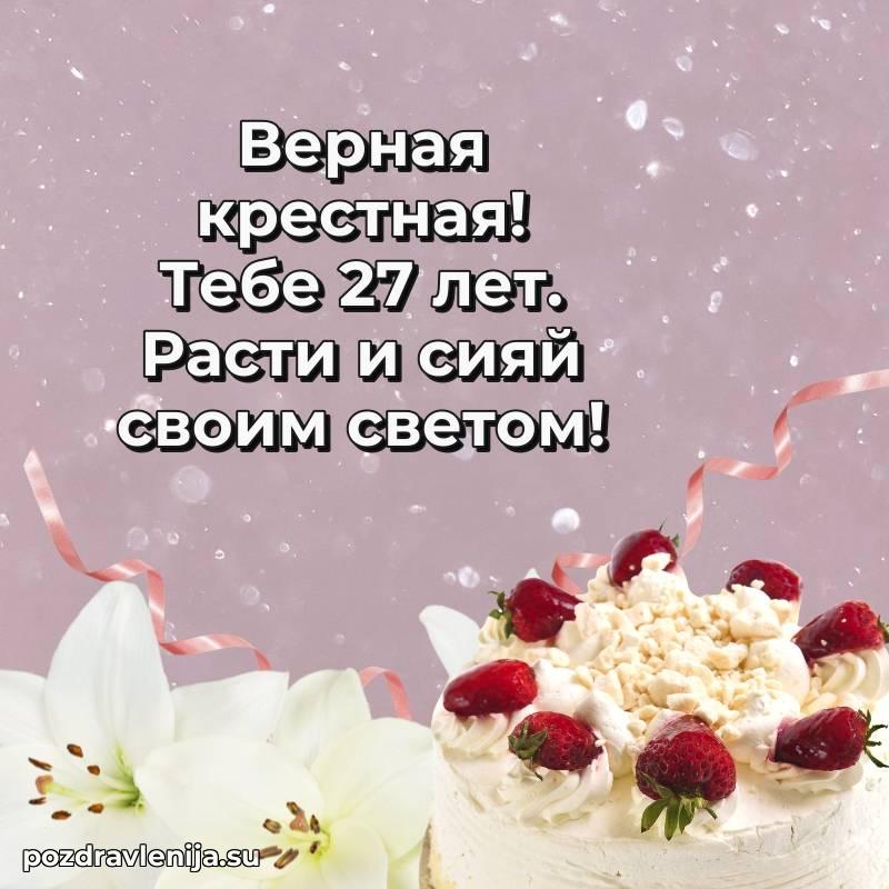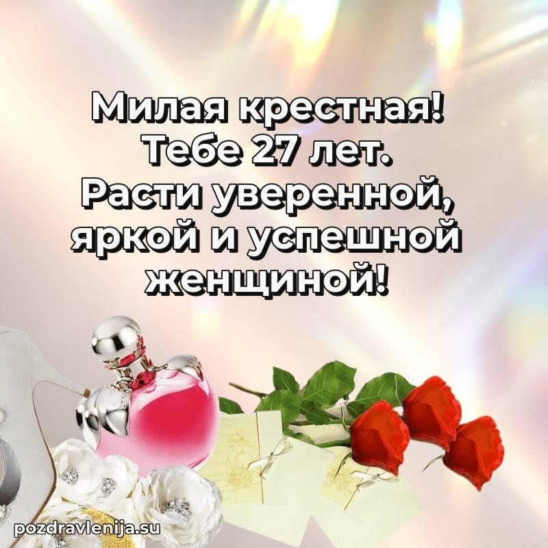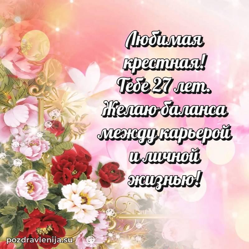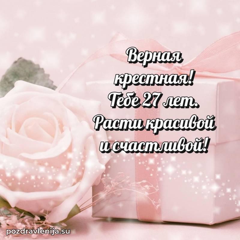 Крёстная, с праздником Вас! В Ваши 27 лет Вы – воплощение заботы. Желаем Вам здоровья на долгие годы, счастья в сердце и чтобы все Ваши планы сбывались. Пусть всё будет замечательно!