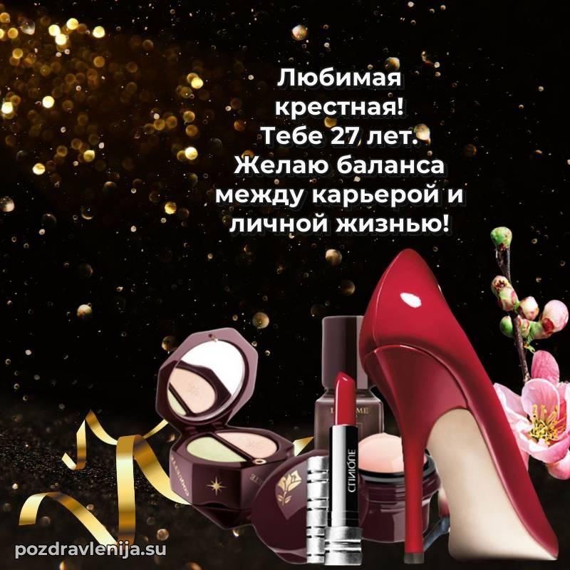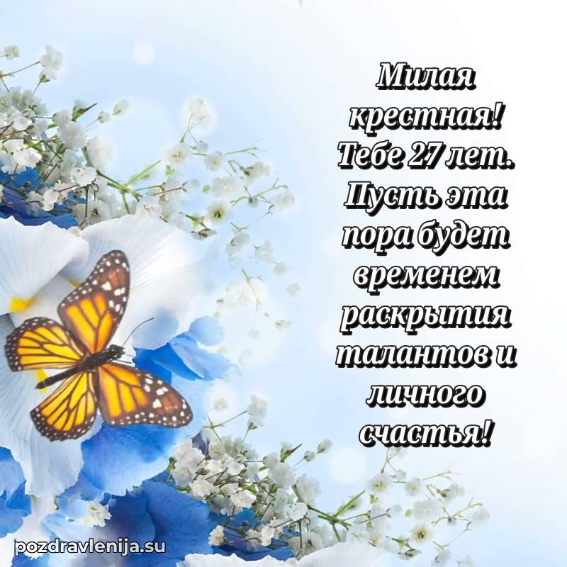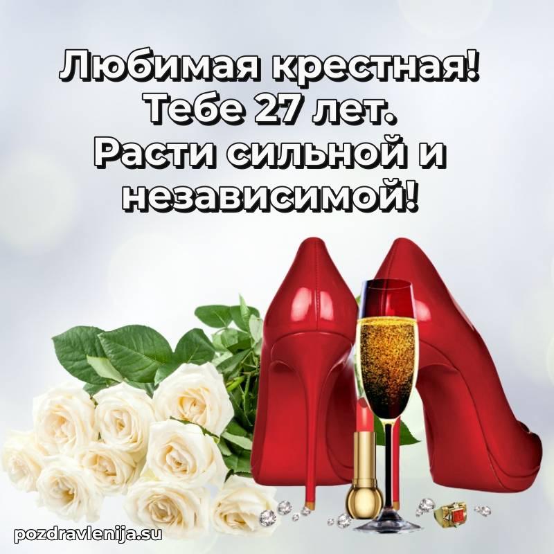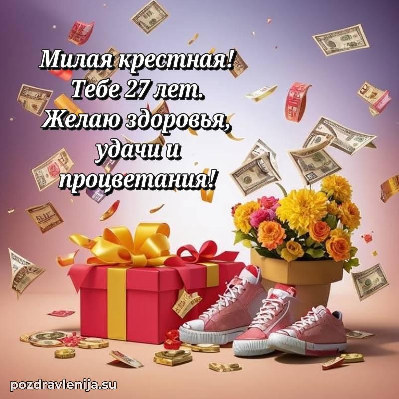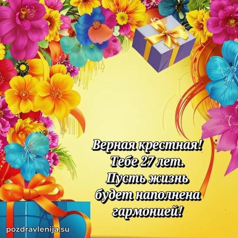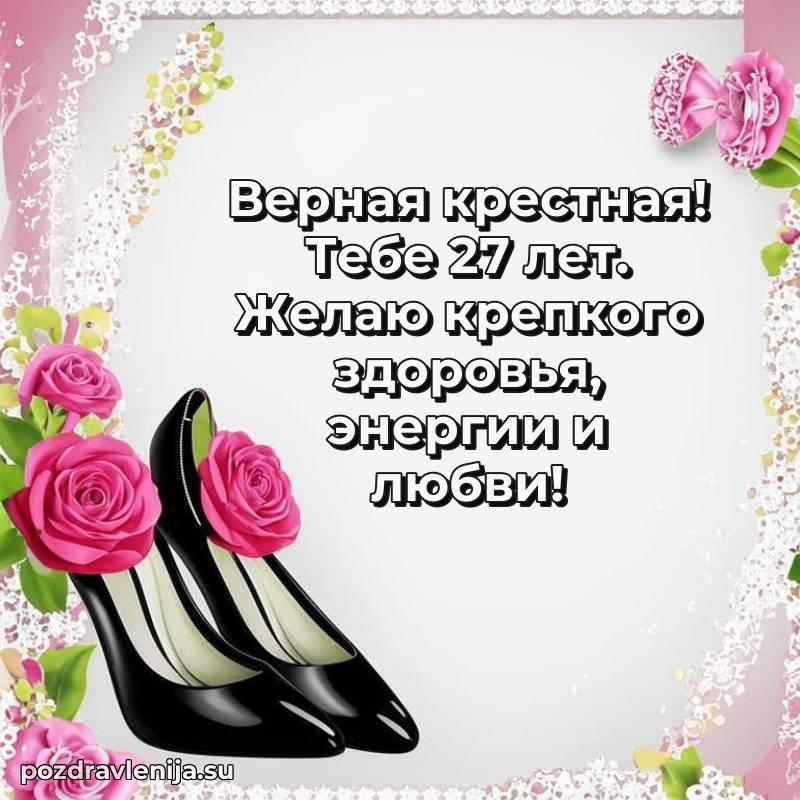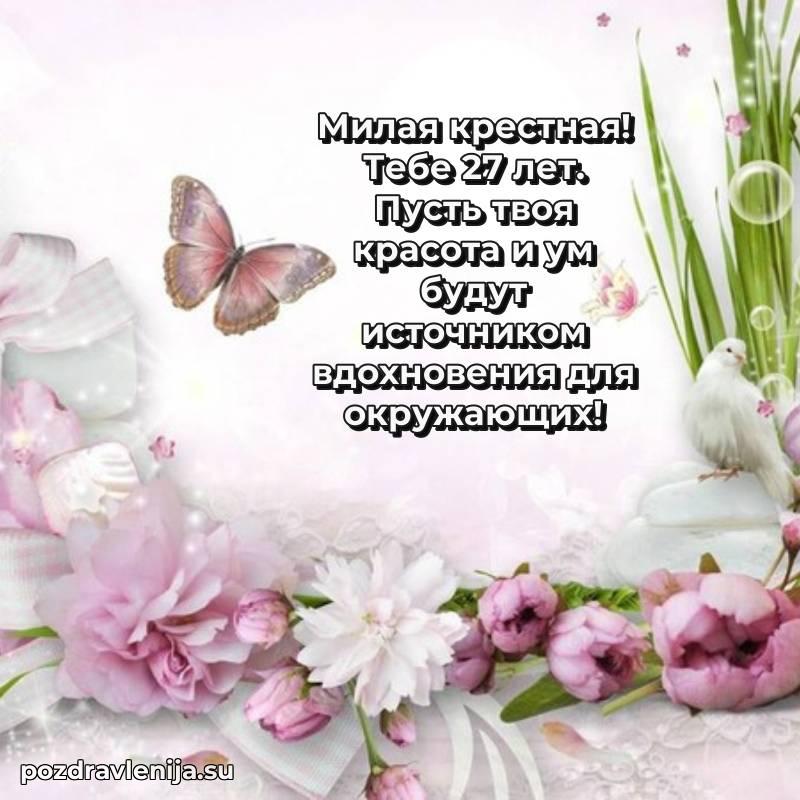 Крёстная, с праздником Вас! В Ваши 27 лет Вы – воплощение заботы. Желаем Вам здоровья на долгие годы, счастья в сердце и чтобы все Ваши планы сбывались. Пусть всё будет замечательно!