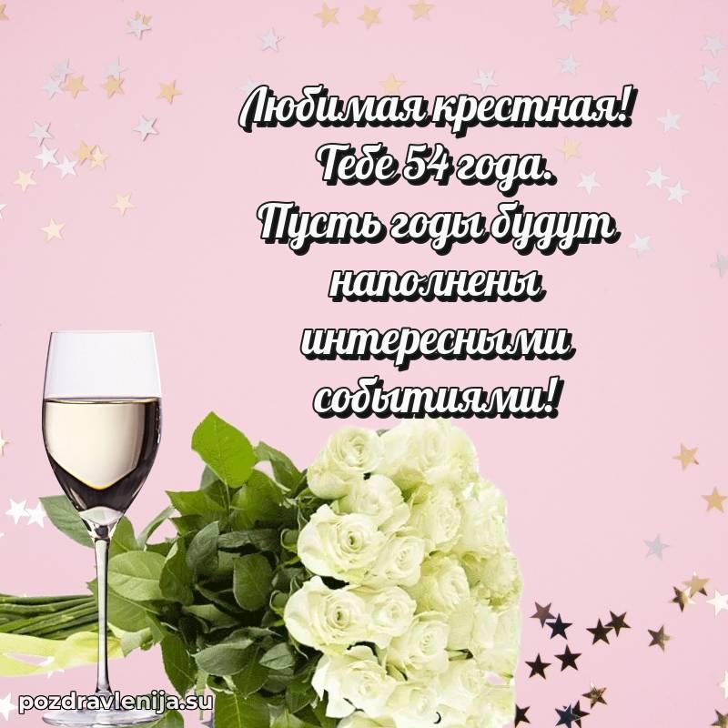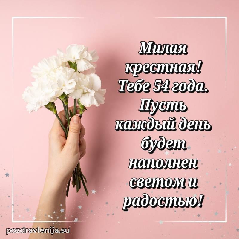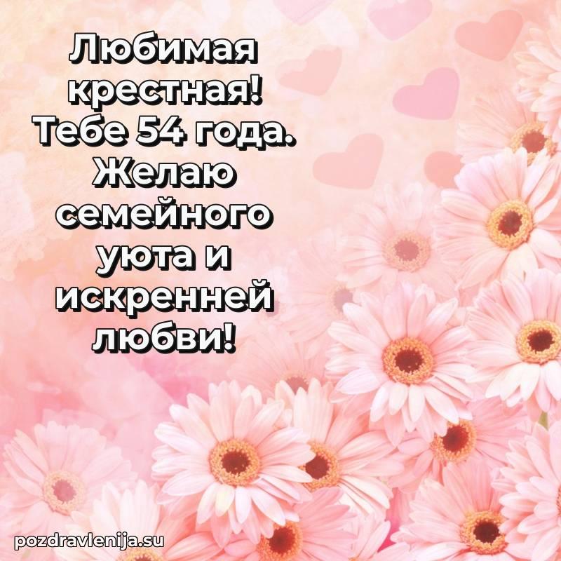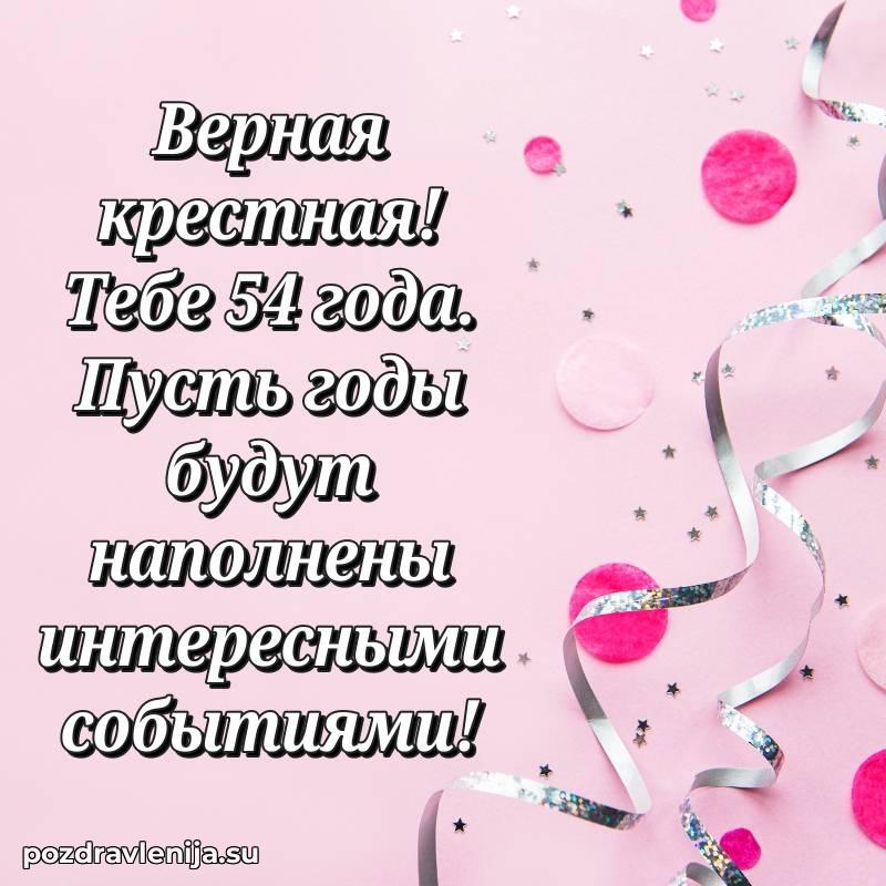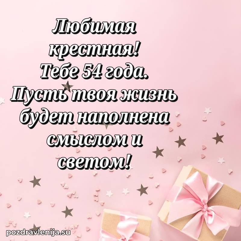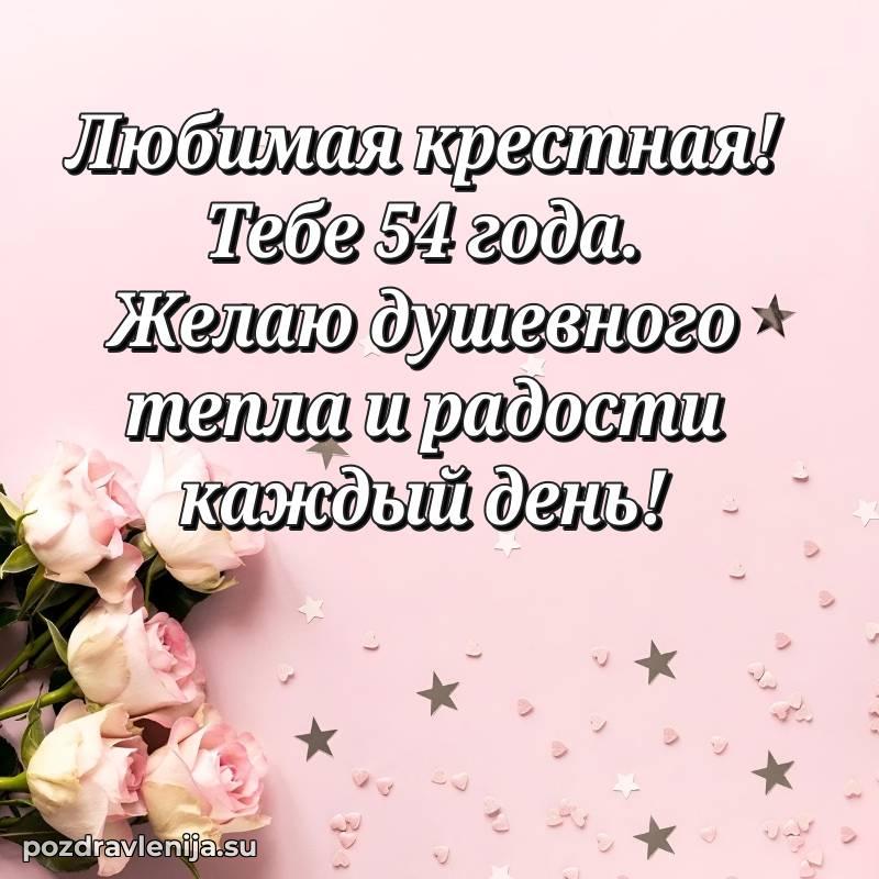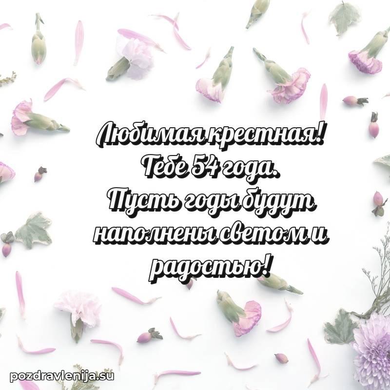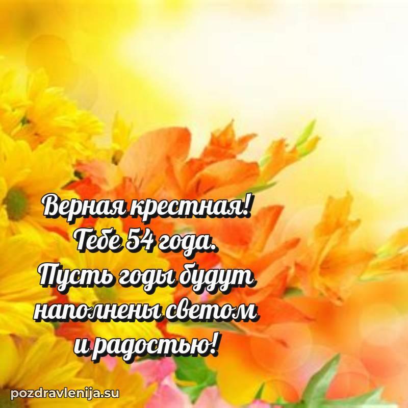 Крёстная, с праздником Вас! В Ваши 54 года Вы – воплощение заботы. Желаем Вам здоровья на долгие годы, счастья в сердце и чтобы все Ваши планы сбывались. Пусть всё будет замечательно!
