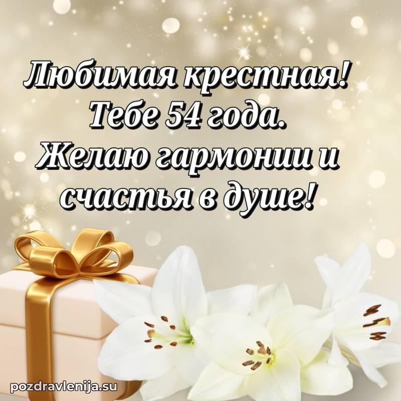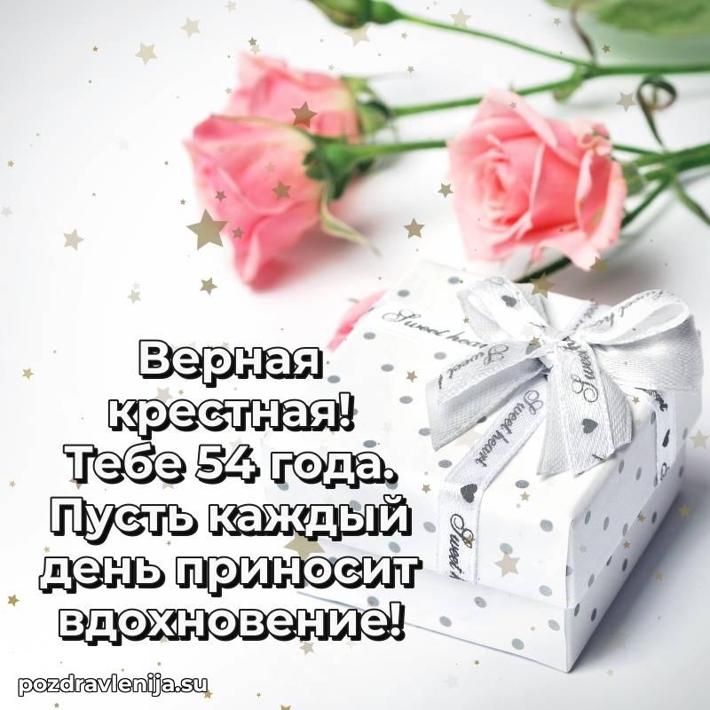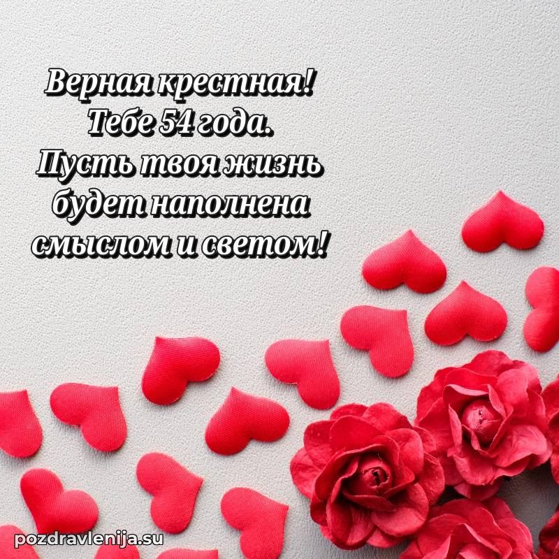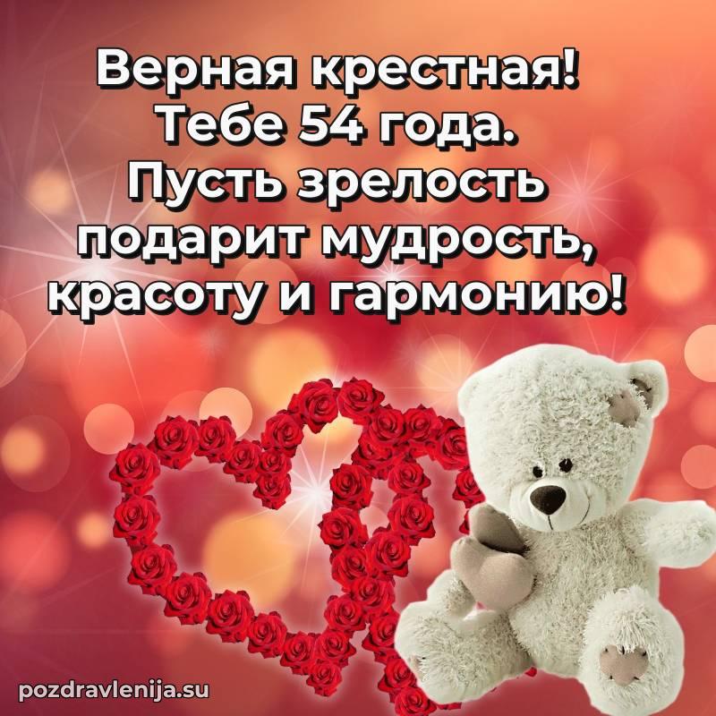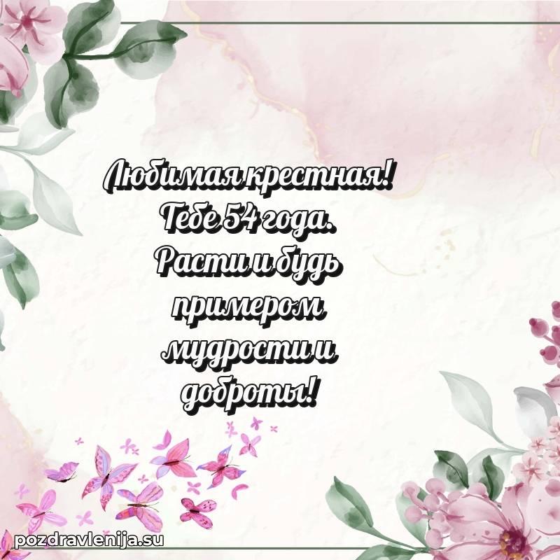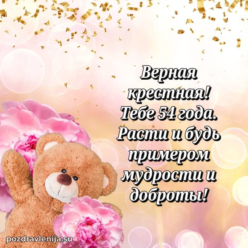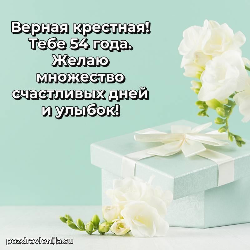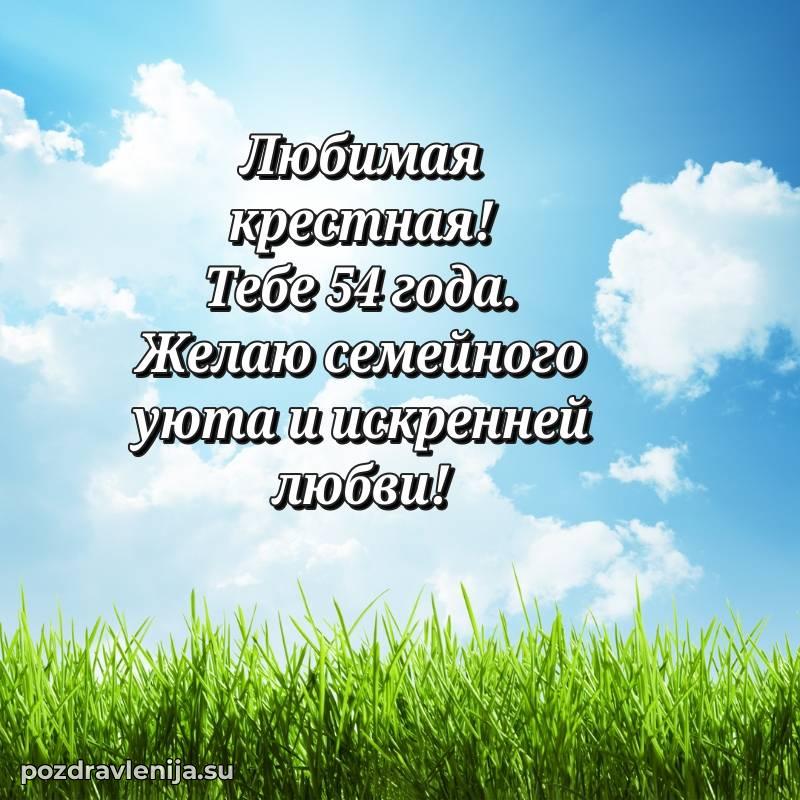 Крёстная, с праздником Вас! В Ваши 54 года Вы – воплощение заботы. Желаем Вам здоровья на долгие годы, счастья в сердце и чтобы все Ваши планы сбывались. Пусть всё будет замечательно!