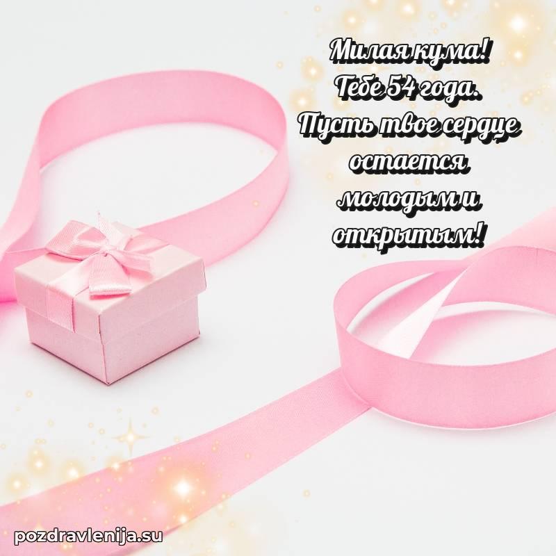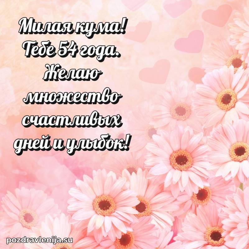 Кума, поздравляю с днем рождения! Желаю тебе крепкого здоровья, удачи в делах и море положительных эмоций. Пусть семья будет твоей опорой, а жизнь — полной радости. Пусть 54 года принесут счастье!