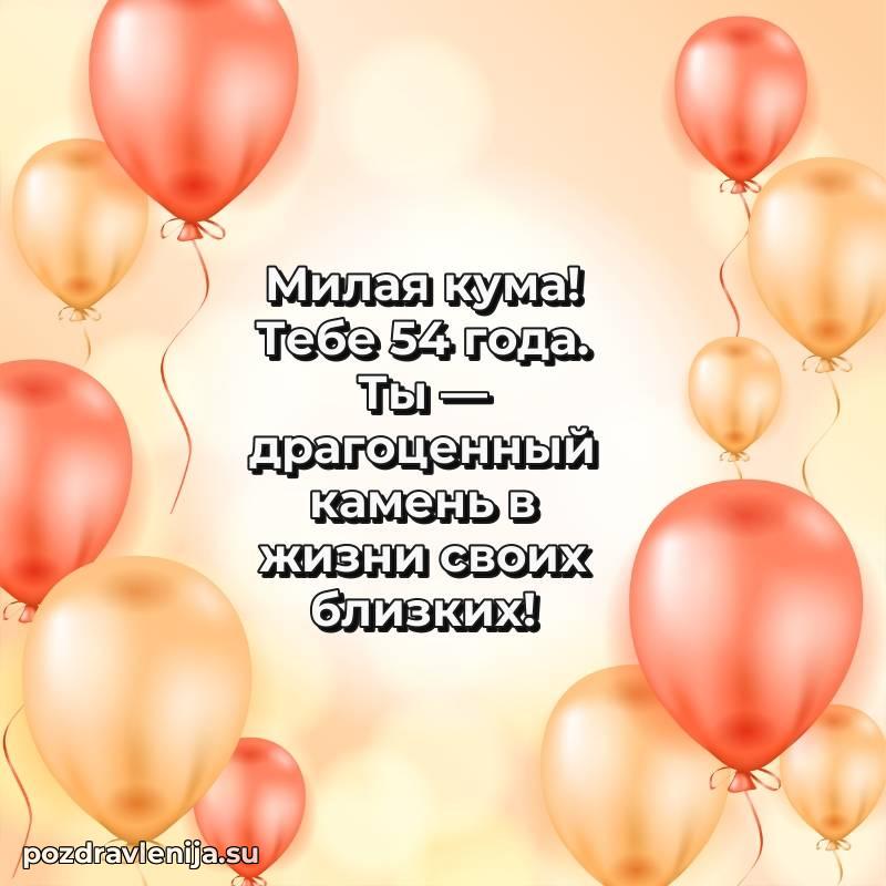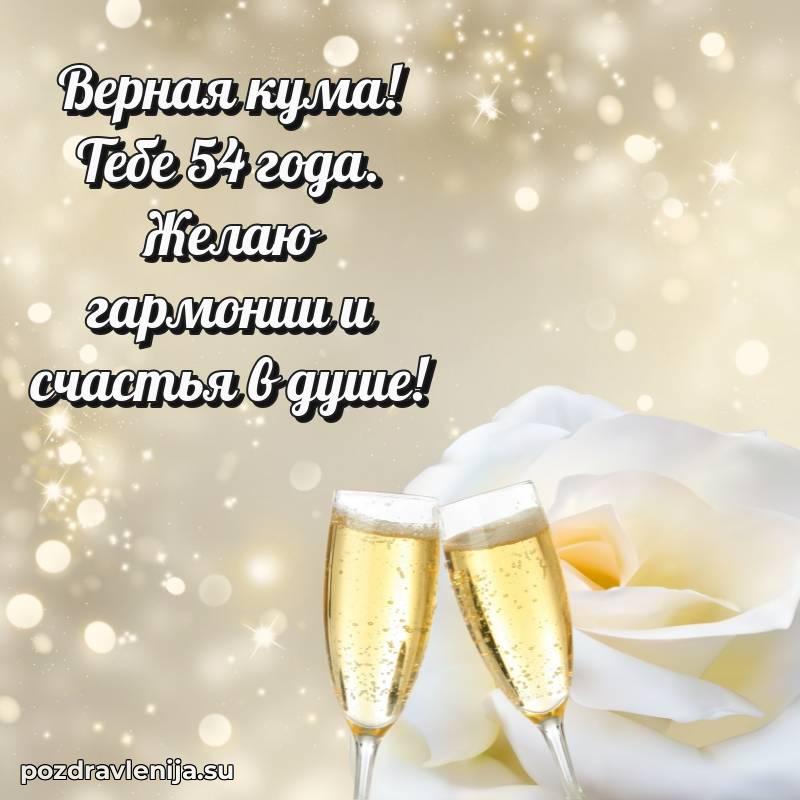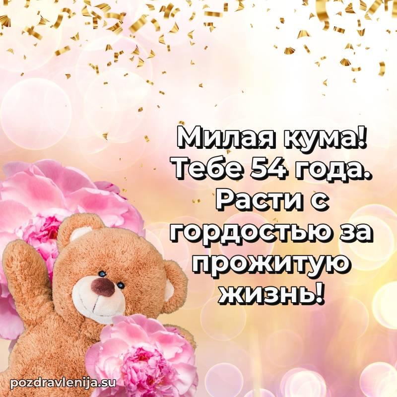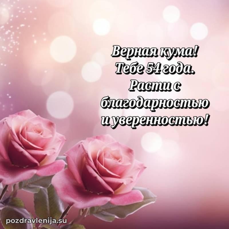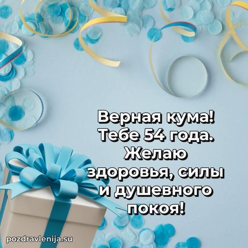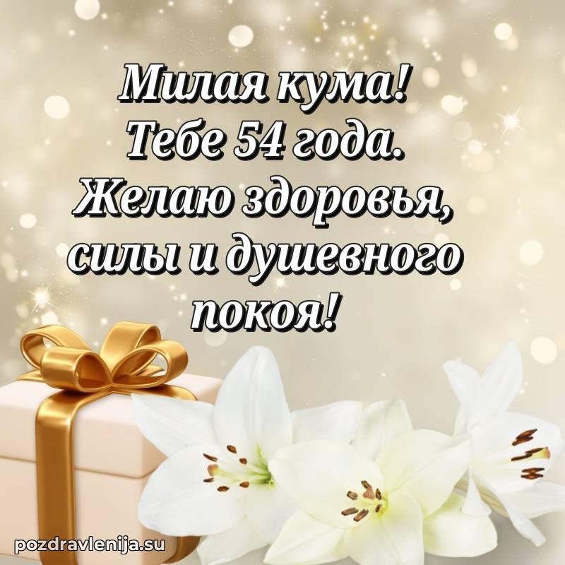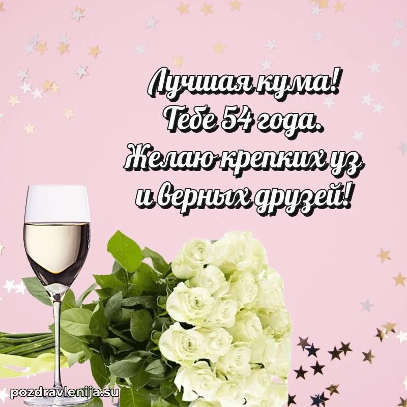 Кума, поздравляю с днем рождения! Желаю тебе крепкого здоровья, удачи во всем и много положительных моментов. Пусть семья будет твоей опорой, а жизнь — полной счастья. За твои 54 года, полные сил!