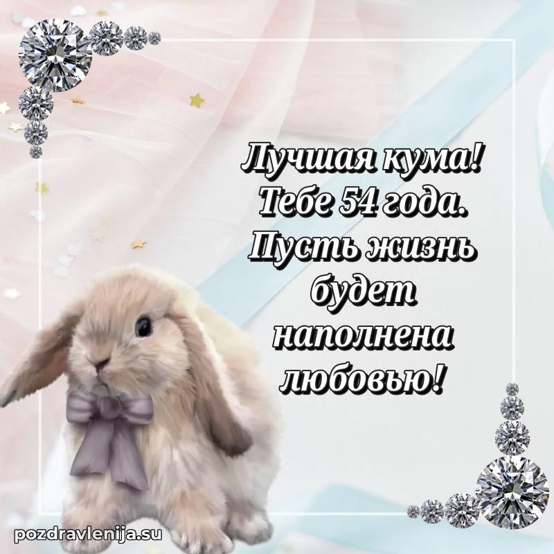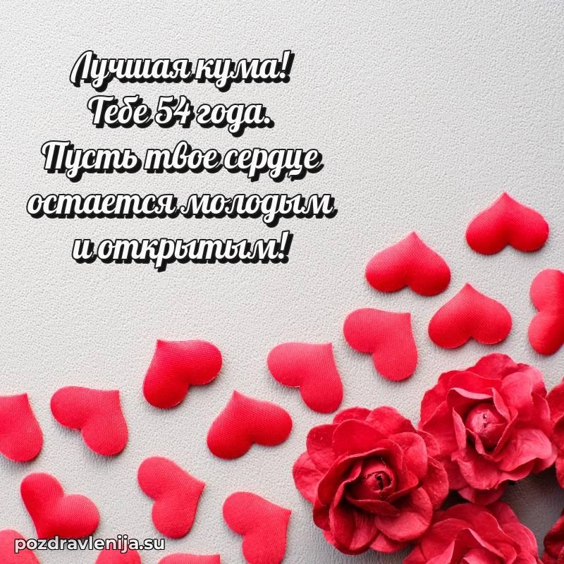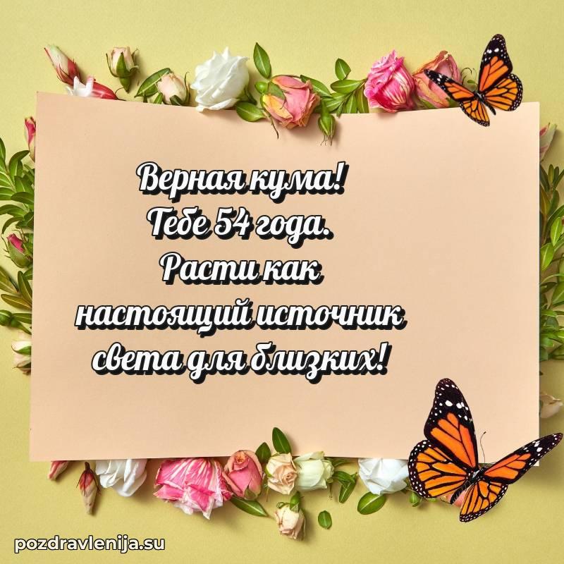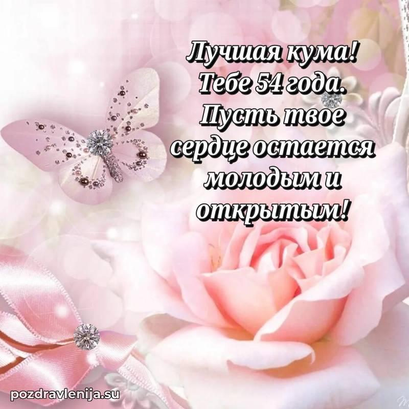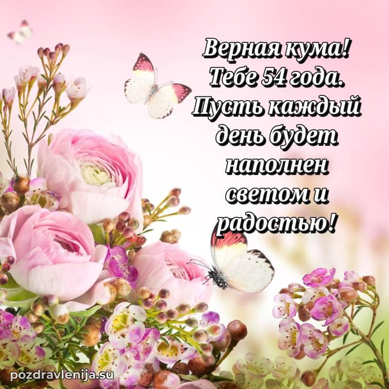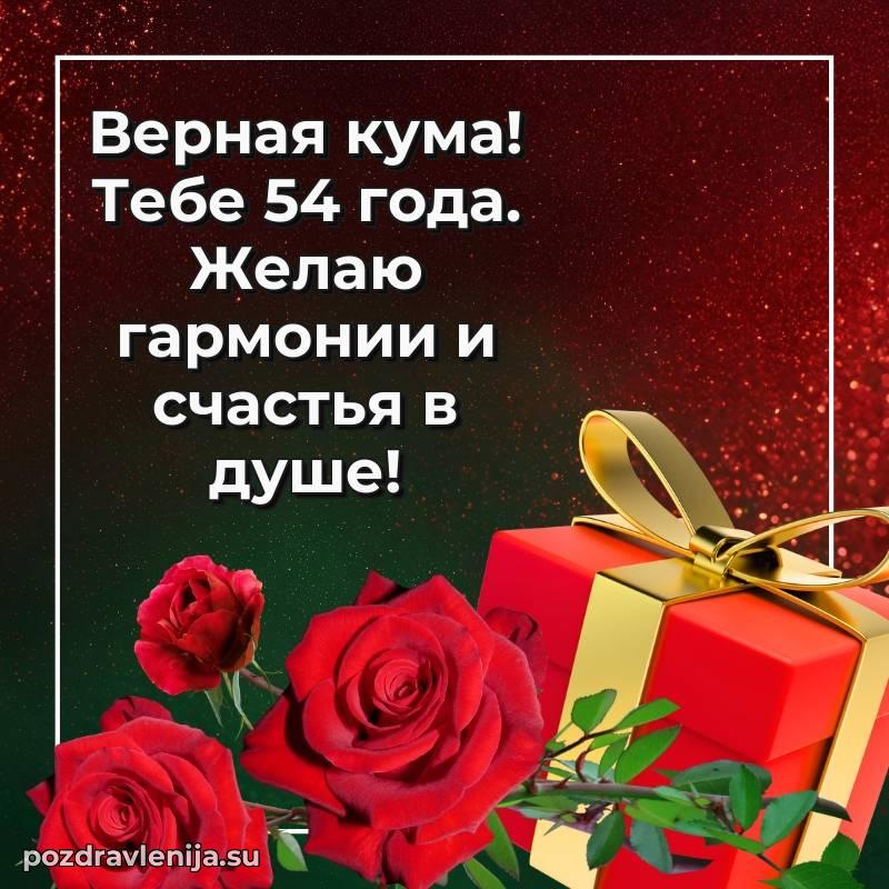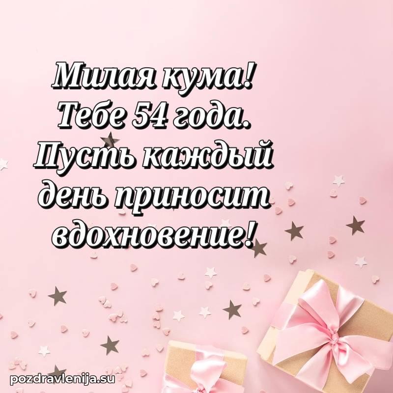 Кума, поздравляю с днем рождения! Желаю тебе крепкого здоровья, удачи во всем и много положительных моментов. Пусть семья будет твоей опорой, а жизнь — полной счастья. За твои 54 года, полные сил!