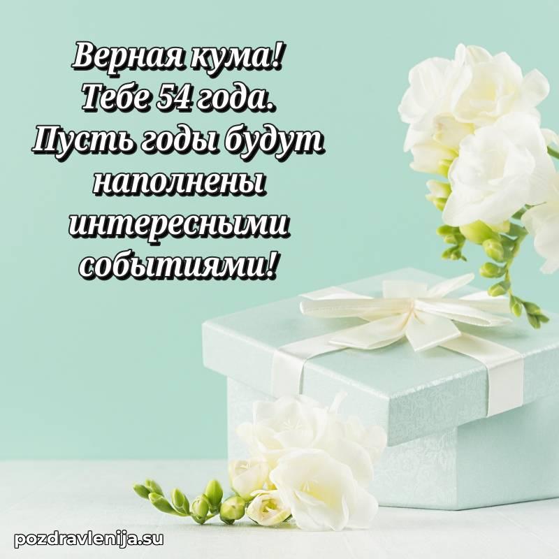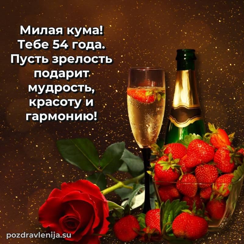 Кума, с днем рождения! Пусть жизнь радует тебя приятными сюрпризами, здоровье будет крепким, а в делах всегда сопутствует удача. Желаю тебе гармонии и достатка. За твои 54 года, полные энергии!