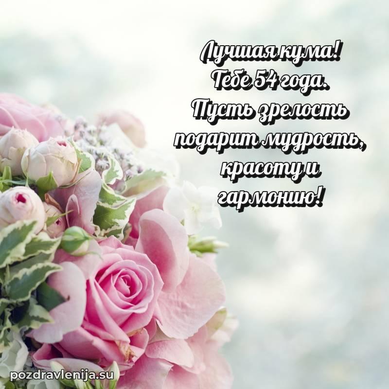Кума, с праздником тебя! Пусть жизнь будет полна хороших событий, здоровье не подводит, а все начинания приносят успех. Желаю тебе гармонии и благополучия. Пусть 54 года станут временем радости!