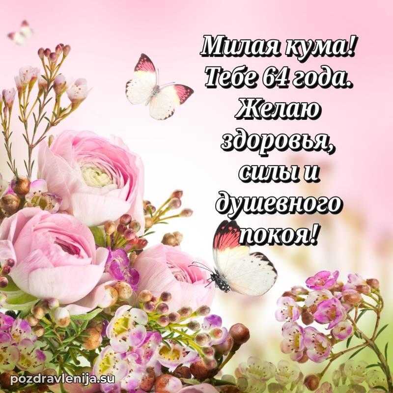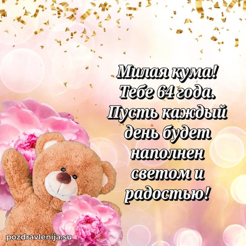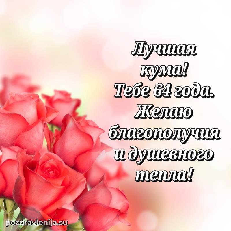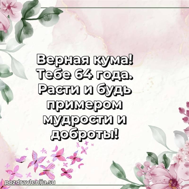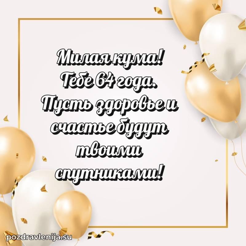 Кума, от всей души поздравляю! Желаю тебе крепкого здоровья, успехов на работе и счастья в личной жизни. Пусть каждый день будет наполнен положительными эмоциями. Пусть 64 года принесут тебе радость и удачу!