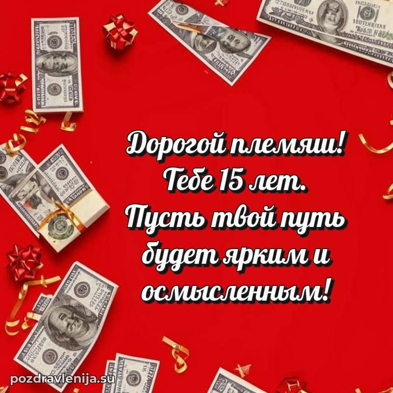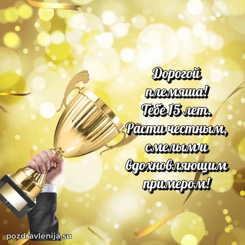 Дорогой племянник! Поздравляю тебя с твоим праздником! Теперь 15 лет – это целый мир возможностей и чудес, открытый перед тобой! Желаю тебе найти свое призвание и всегда следовать за мечтой!
