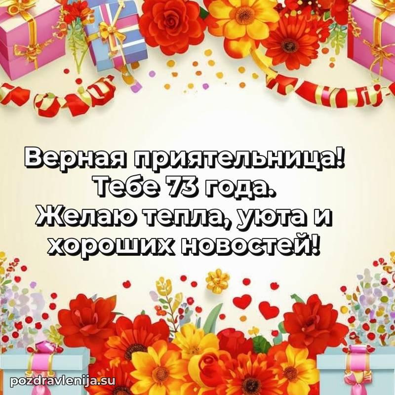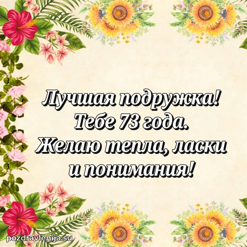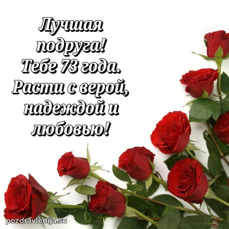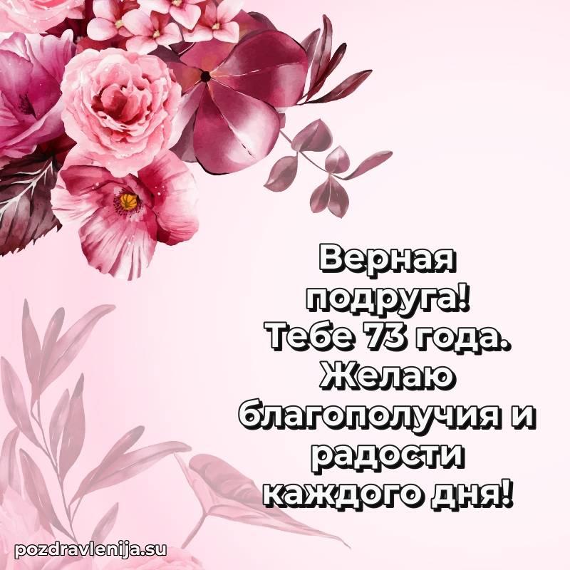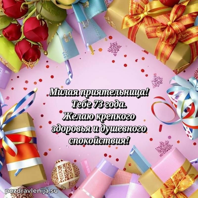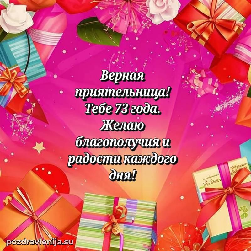 У нас вы найдете широкий выбор красивых и оригинальных поздравлений Подруге на 73 года с Днем Рождения, составленных с душой и вниманием к деталям. В данном разделе представлены поздравления как в стихах, способные вызвать улыбку и радость, так и трогательные поздравления в прозе, исполненные своими словами.