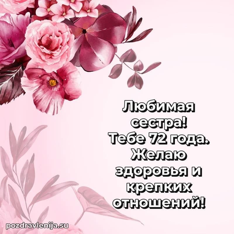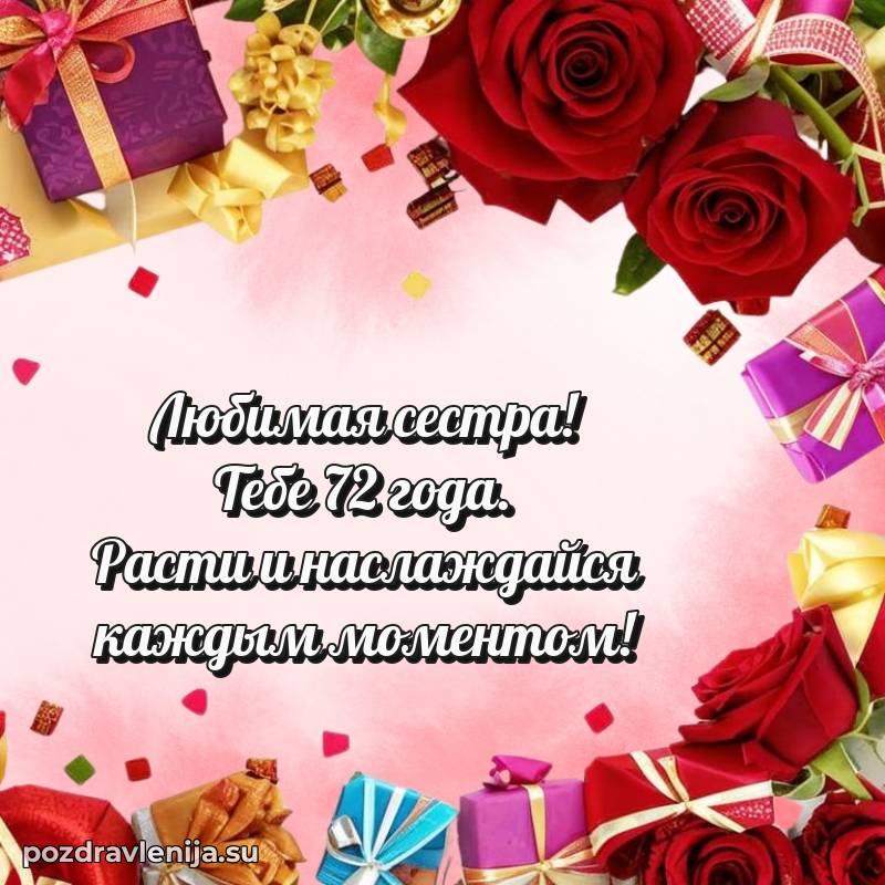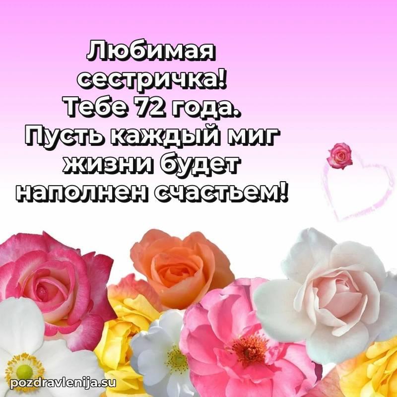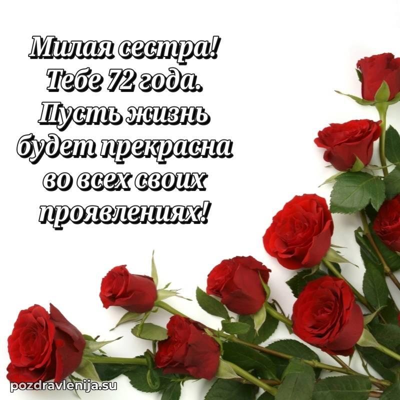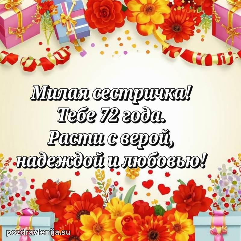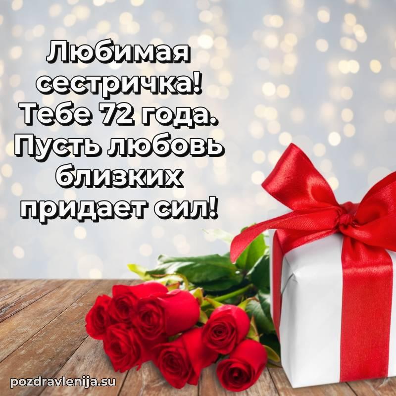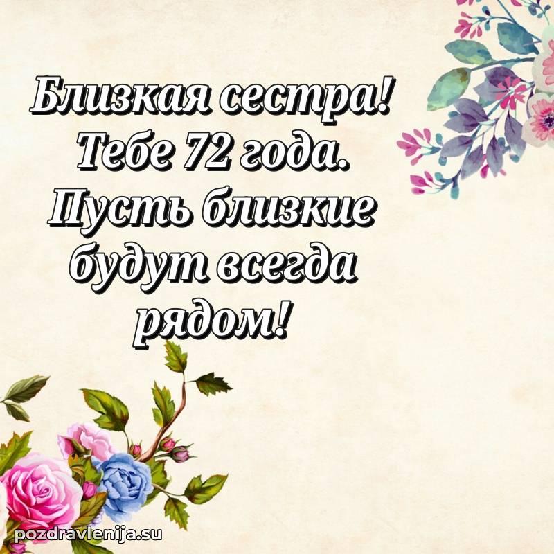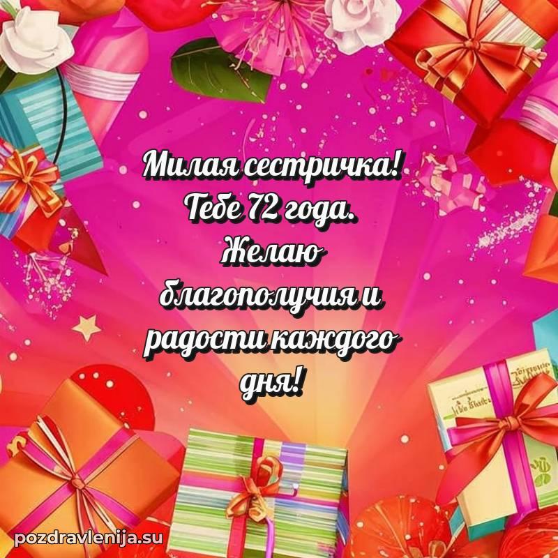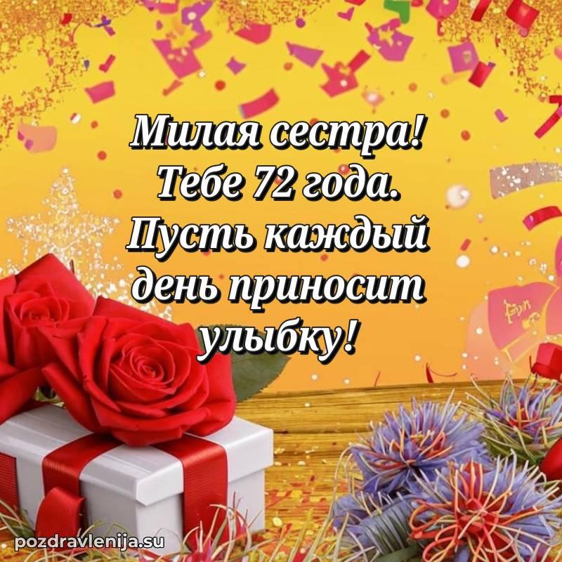 Сестра, пусть возраст 72 года всегда приносит только мудрость и вдохновение, а здоровье и настроение будут на высотеПусть сбываются самые заветные мечты!
