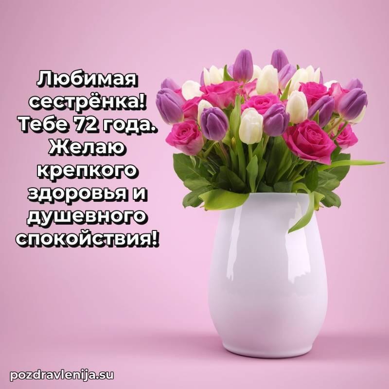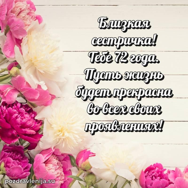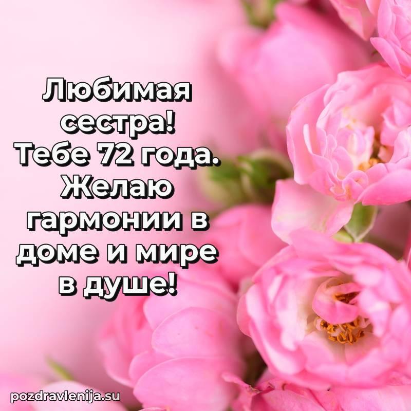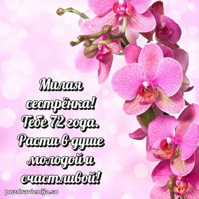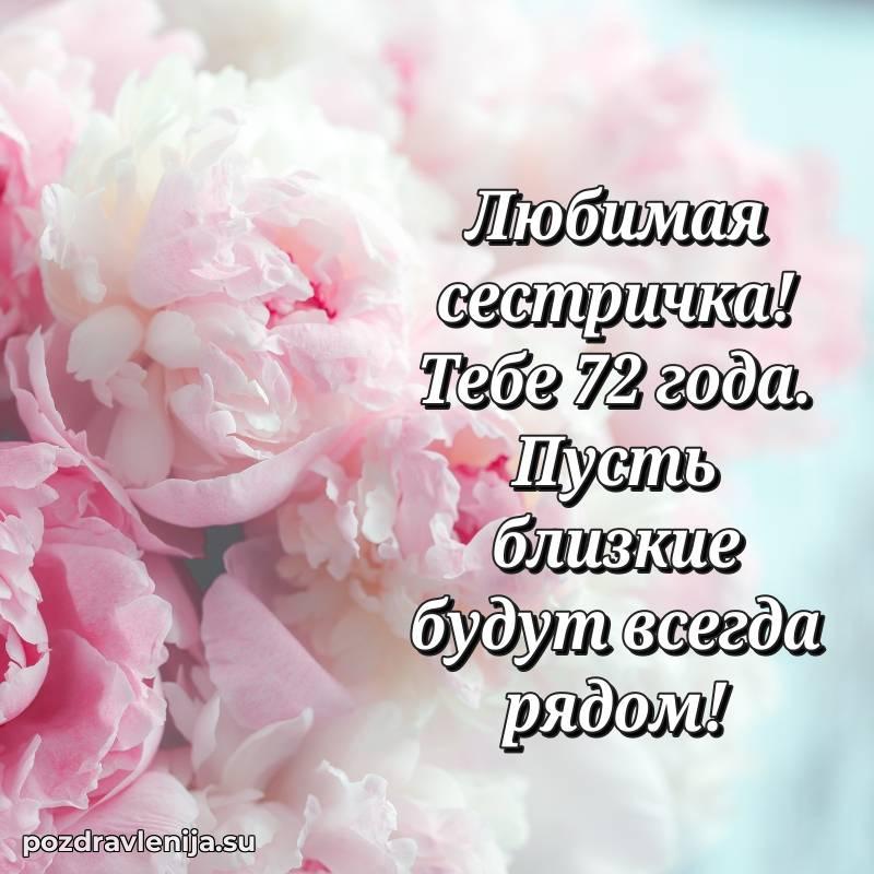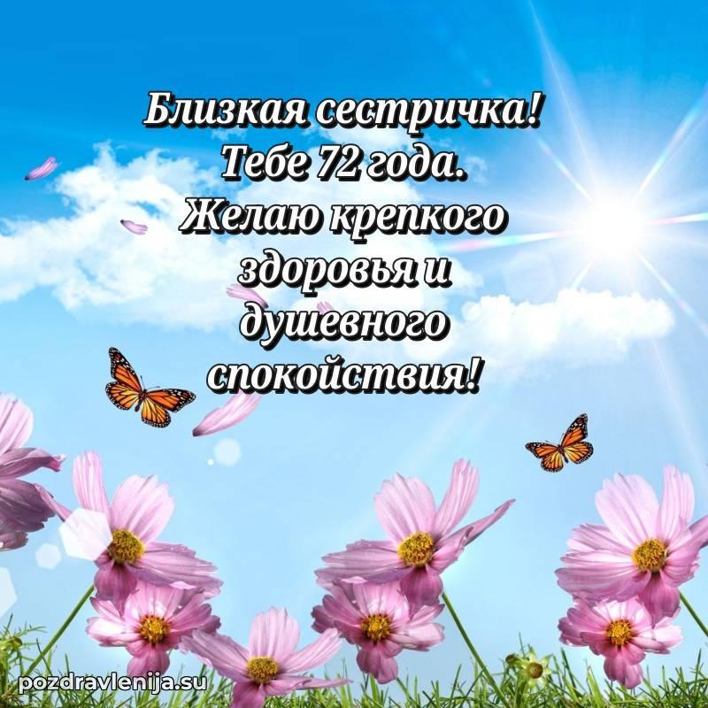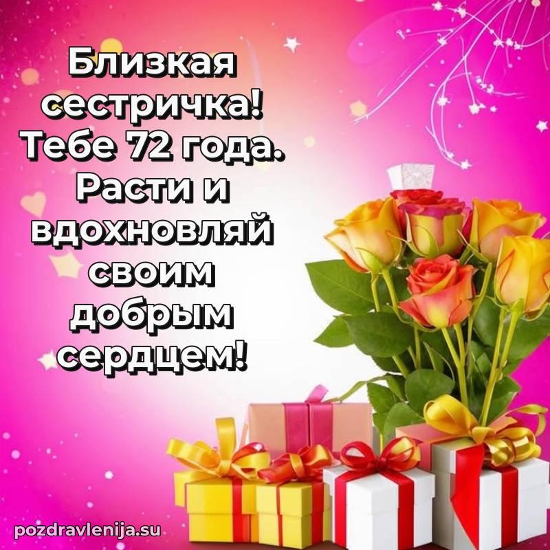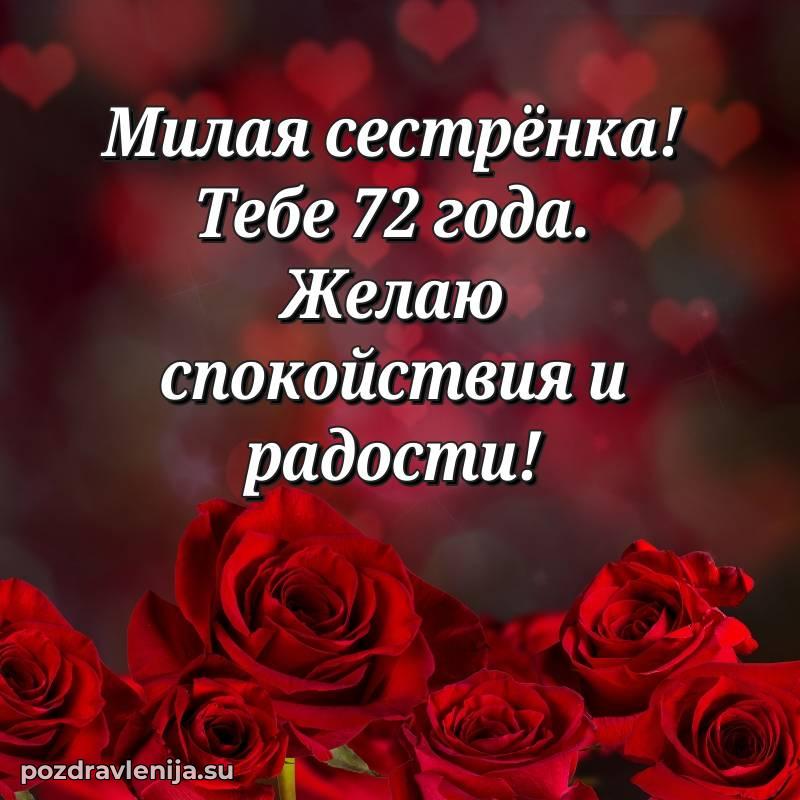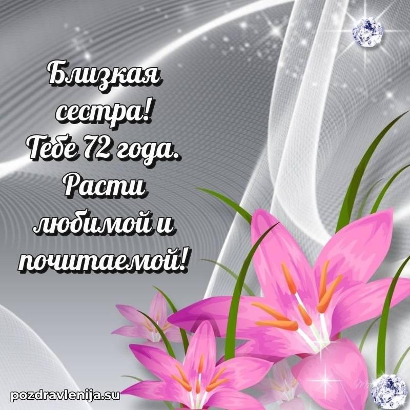 Сестра, пусть возраст 72 года всегда приносит только мудрость и вдохновение, а здоровье и настроение будут на высотеПусть сбываются самые заветные мечты!