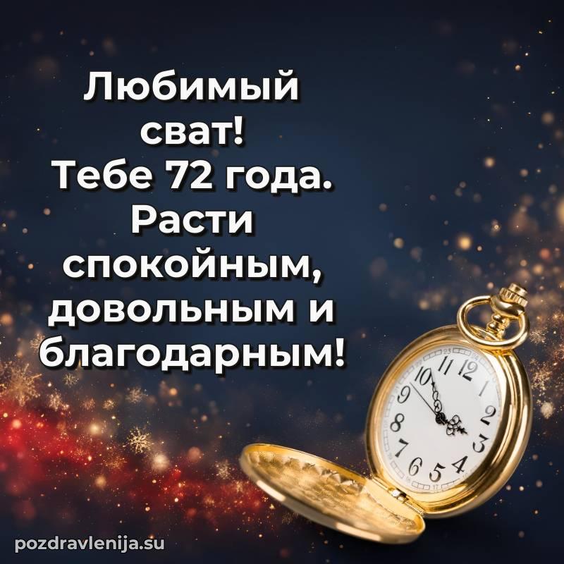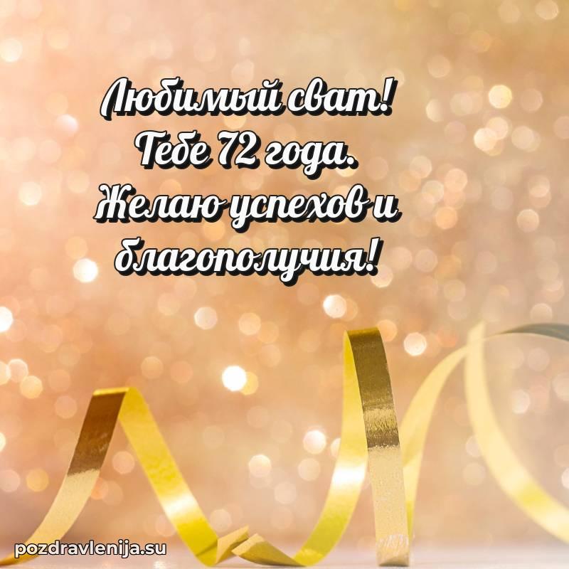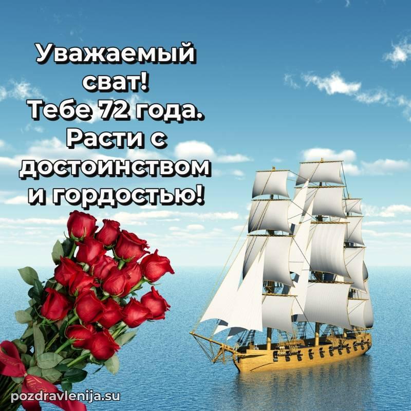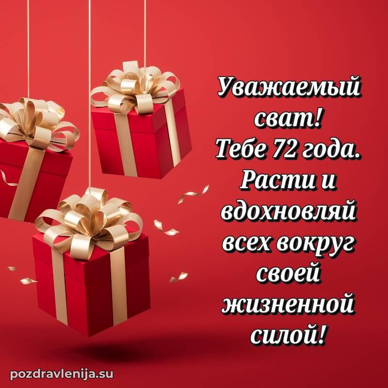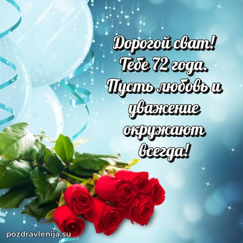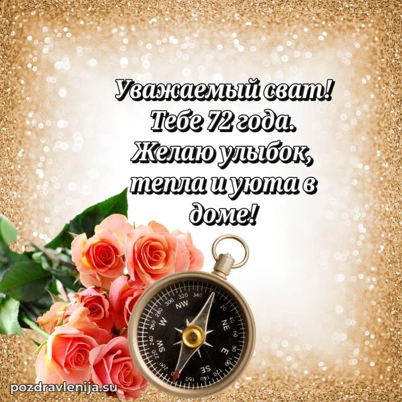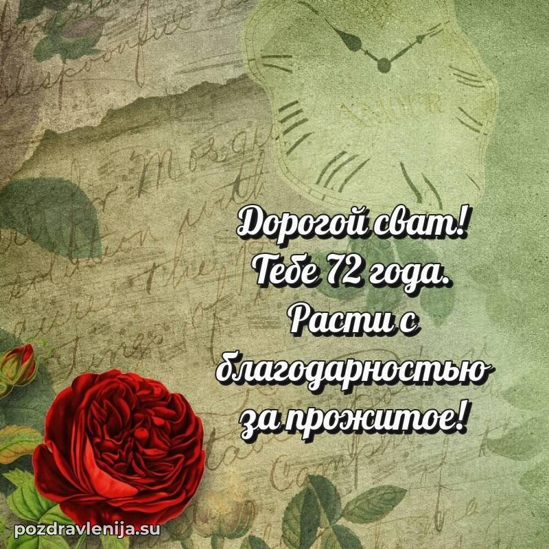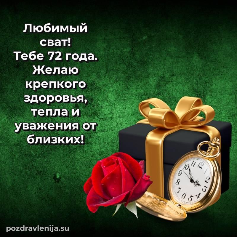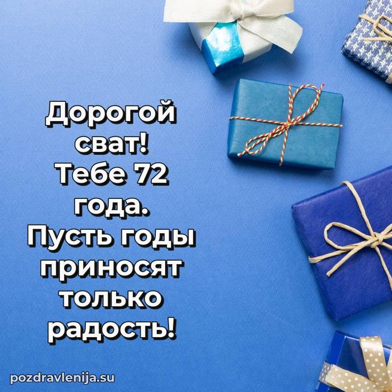 Сват родной, с праздником Вас! Пусть жизнь будет как добрая сказка — полна чудес и счастливых моментов. Желаю Вам крепкого здоровья, много энергии и радости в каждом дне. Пусть 72 года приносят только счастье!