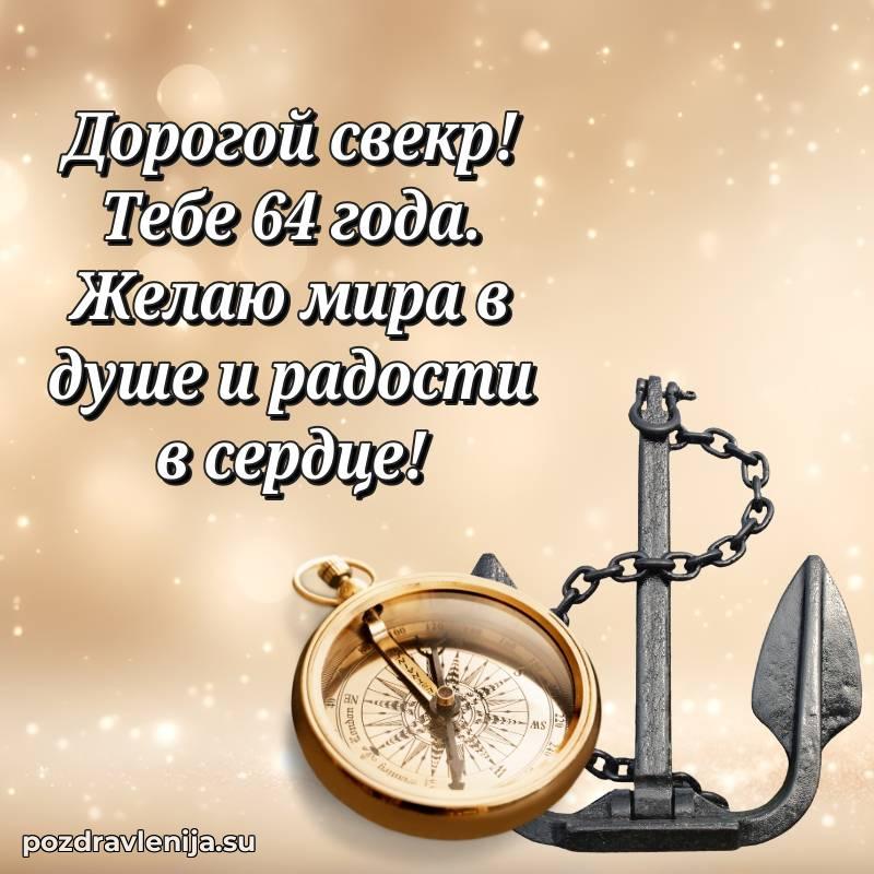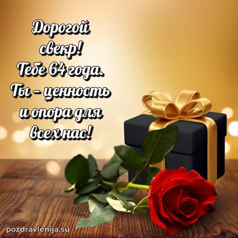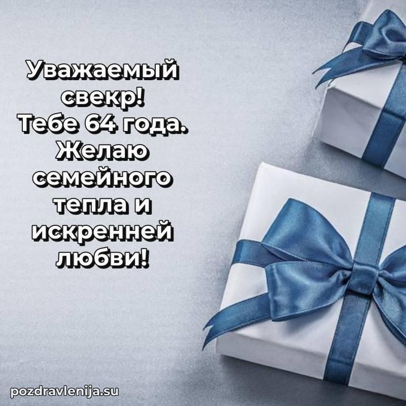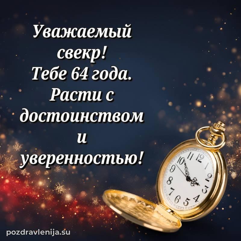 Свекр дорогой, этот тост для Вас! Пусть Ваша жизнь будет яркой, как летнее солнце, и теплой, как семейный очаг. Желаю Вам неиссякаемого здоровья, успехов во всех делах и радости в каждом мгновении. За Ваши 64 года, которые открывают новые страницы счастья!