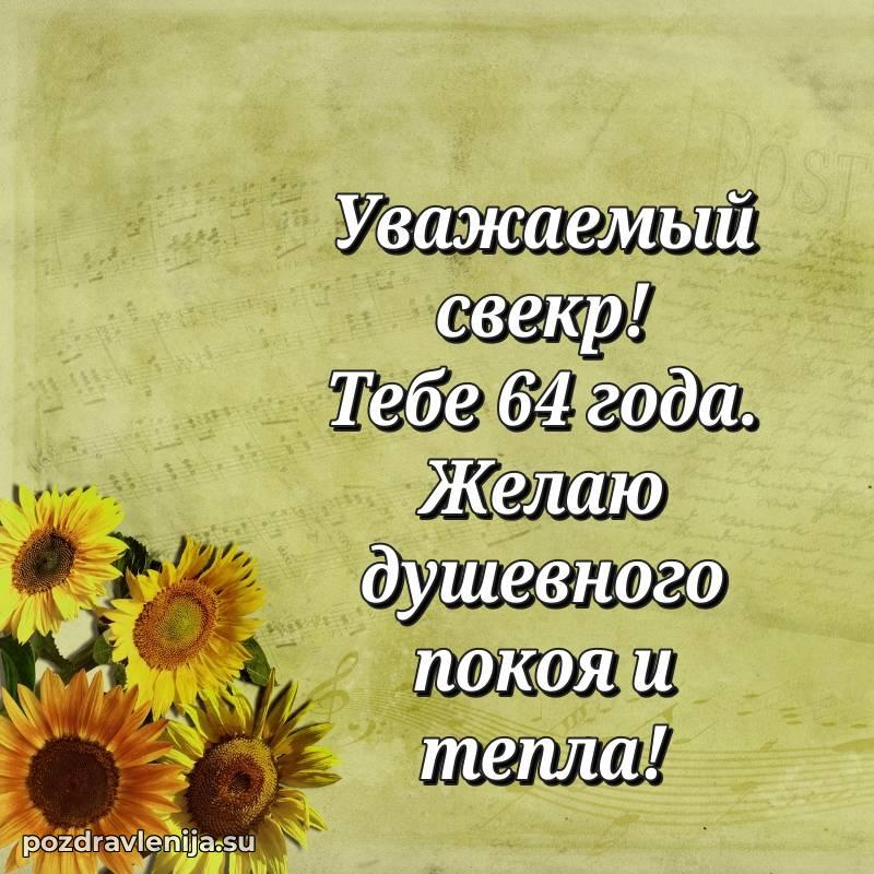 Свекр дорогой, тост за Вас! Пусть каждый новый день приносит радость, а каждый вечер — чувство выполненного долга. Желаю Вам здоровья, удачи и бесконечного оптимизма. Пусть близкие радуют своей заботой. За Ваши 64 года, которые открывают новые горизонты!