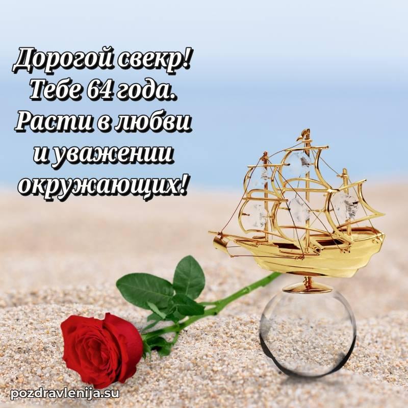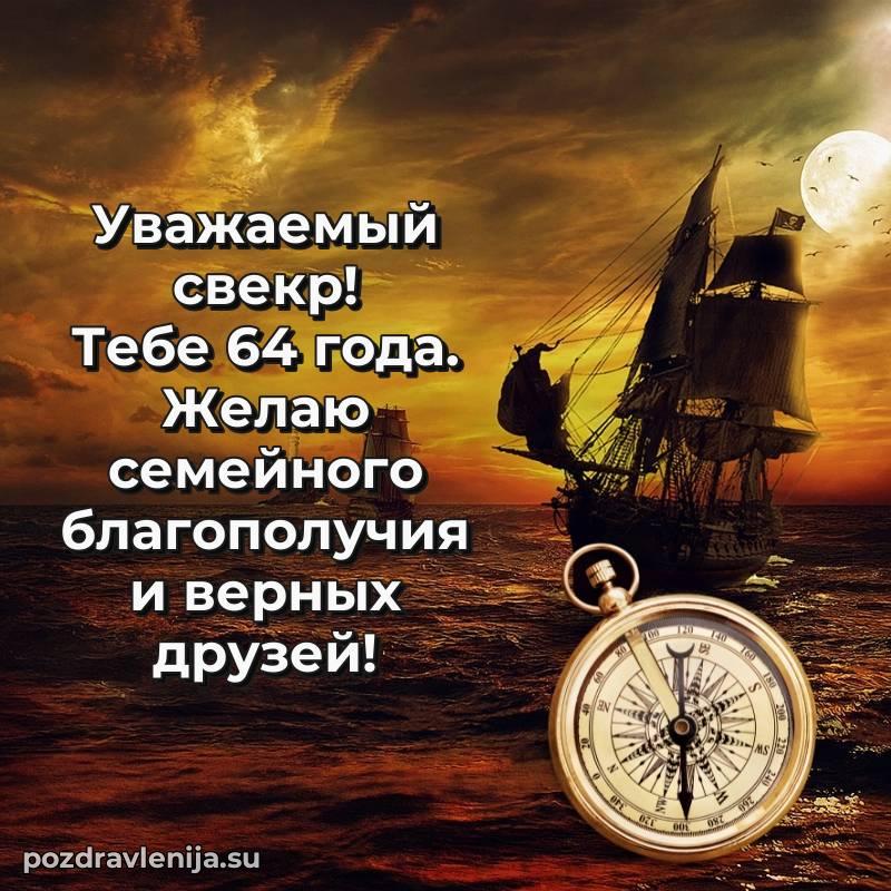 Свекр родной, поднимаю бокал за Вас! Пусть жизнь будет как крепкий корабль — уверенно идет по волнам, встречая только попутный ветер. Желаю Вам здоровья, счастья и благополучия во всем. За Ваши 64 года, полные силы и вдохновения!