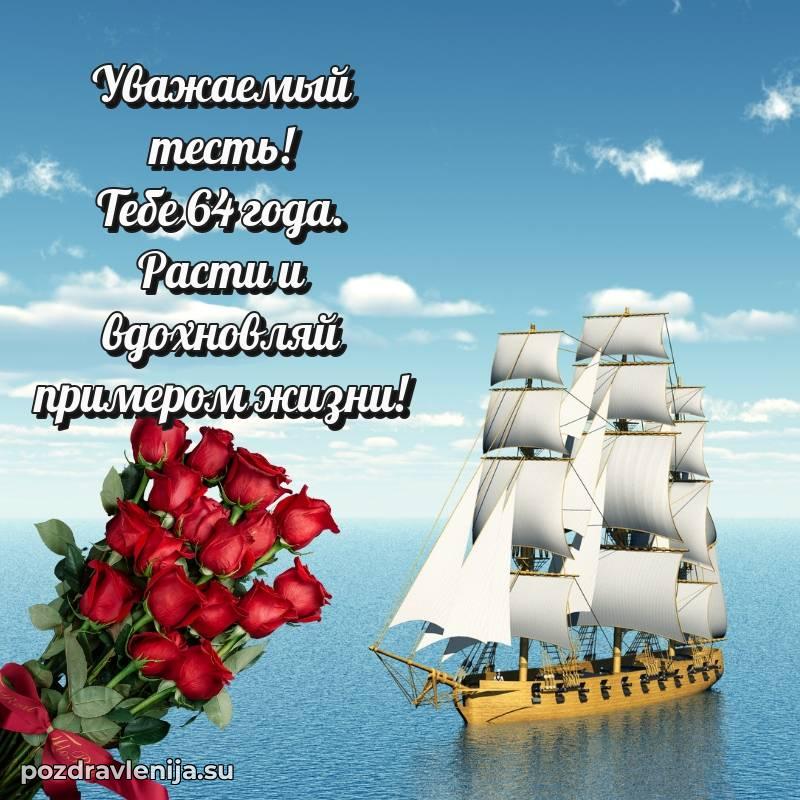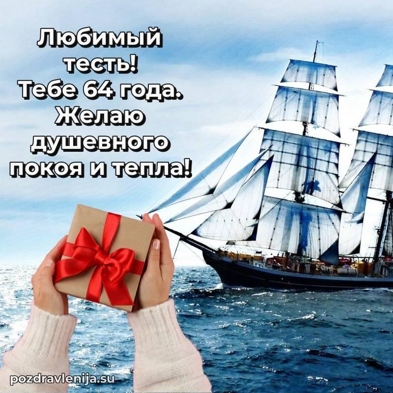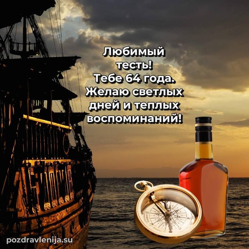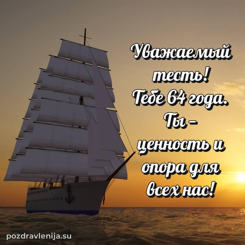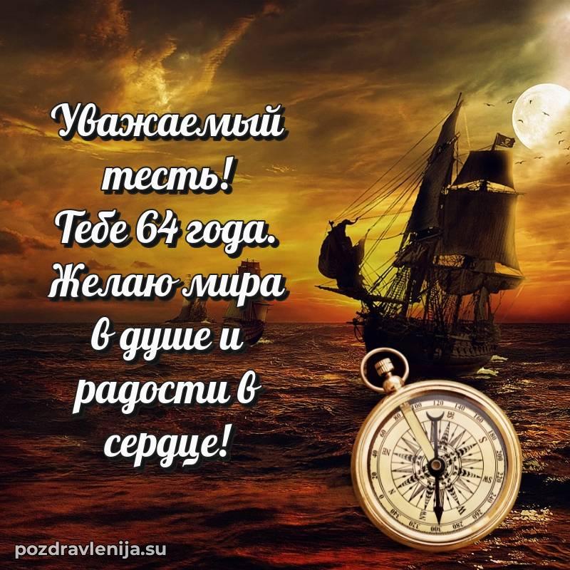 Тесть родной, поднимаю бокал за Вас! Пусть жизнь будет как крепкий корабль — уверенно идет по волнам, встречая только попутный ветер. Желаю Вам здоровья, счастья и благополучия во всем. За Ваши 64 года, полные силы и вдохновения!