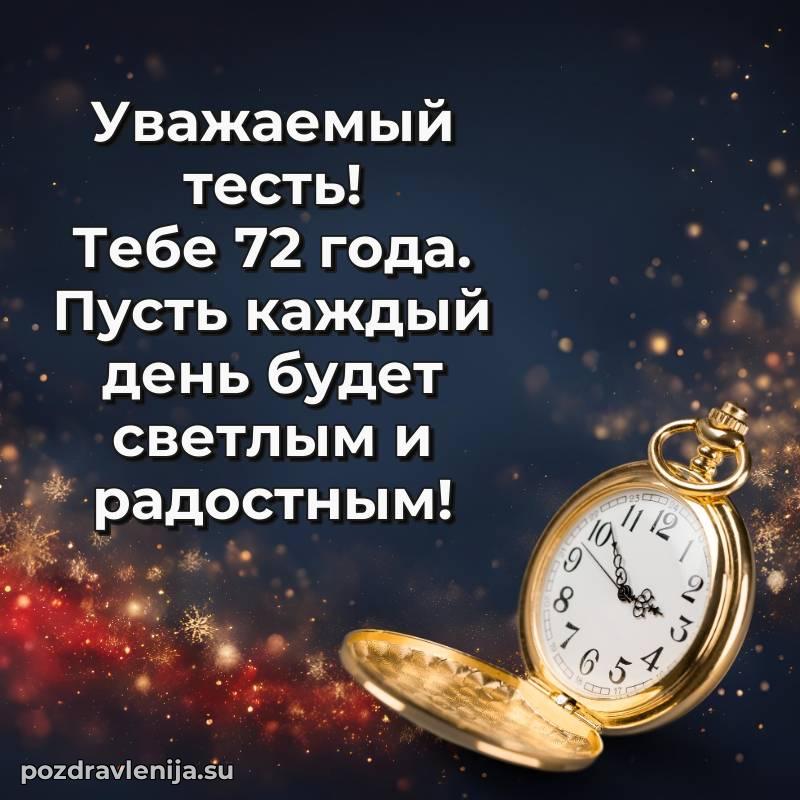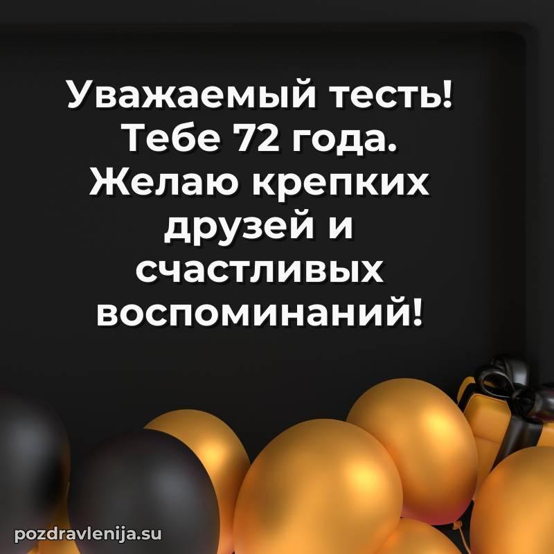 Тесть родной, этот тост для Вас! Пусть жизнь будет как красивая мелодия — полна гармонии, радости и ярких нот. Желаю Вам крепкого здоровья, удачи во всех делах и теплоты от близких. За Ваши 72 года, которые стали символом мудрости!