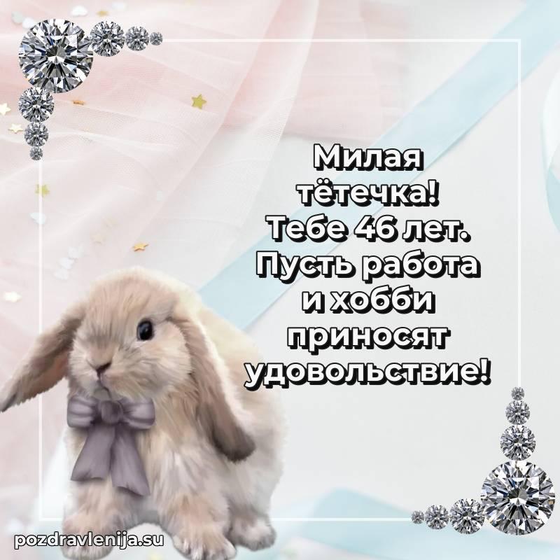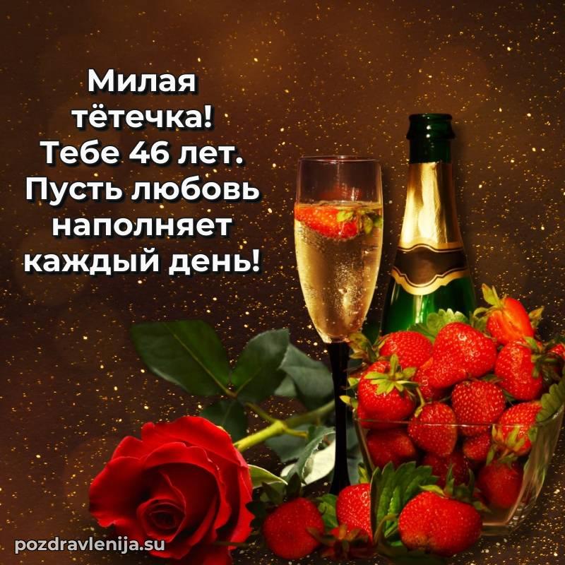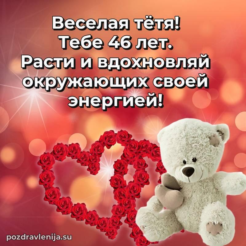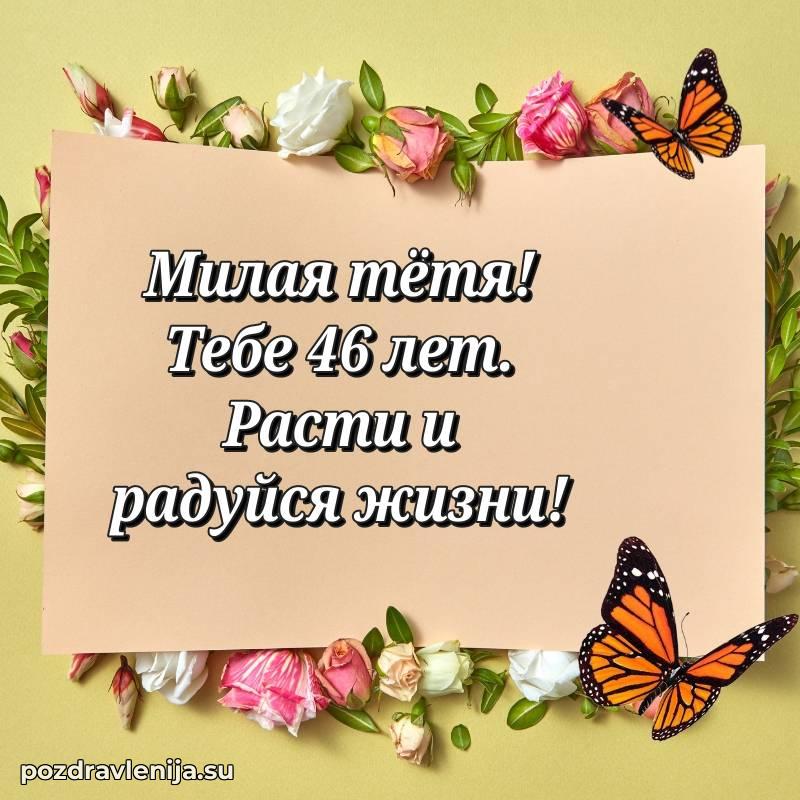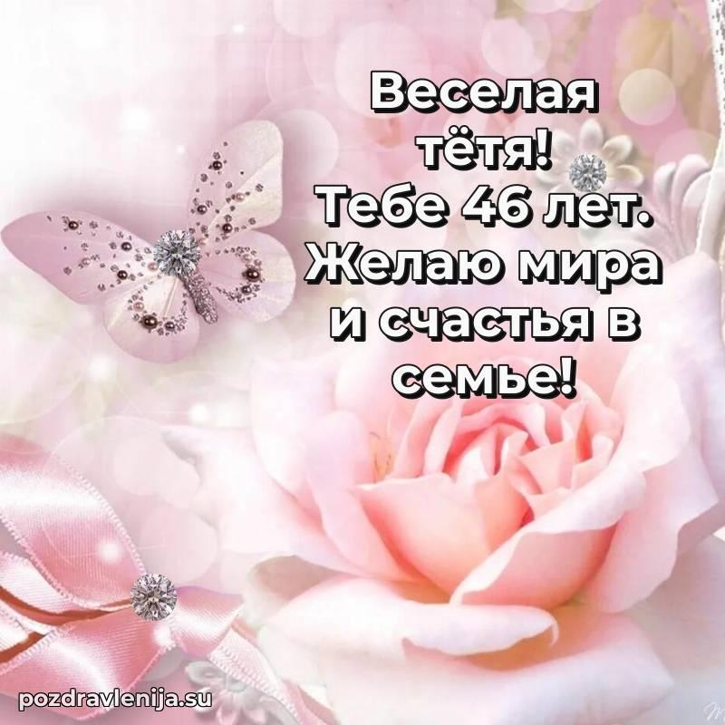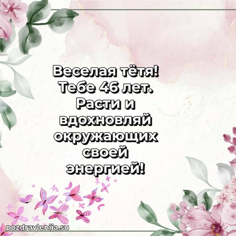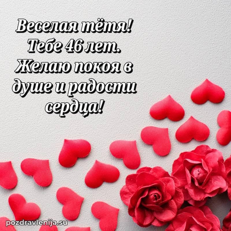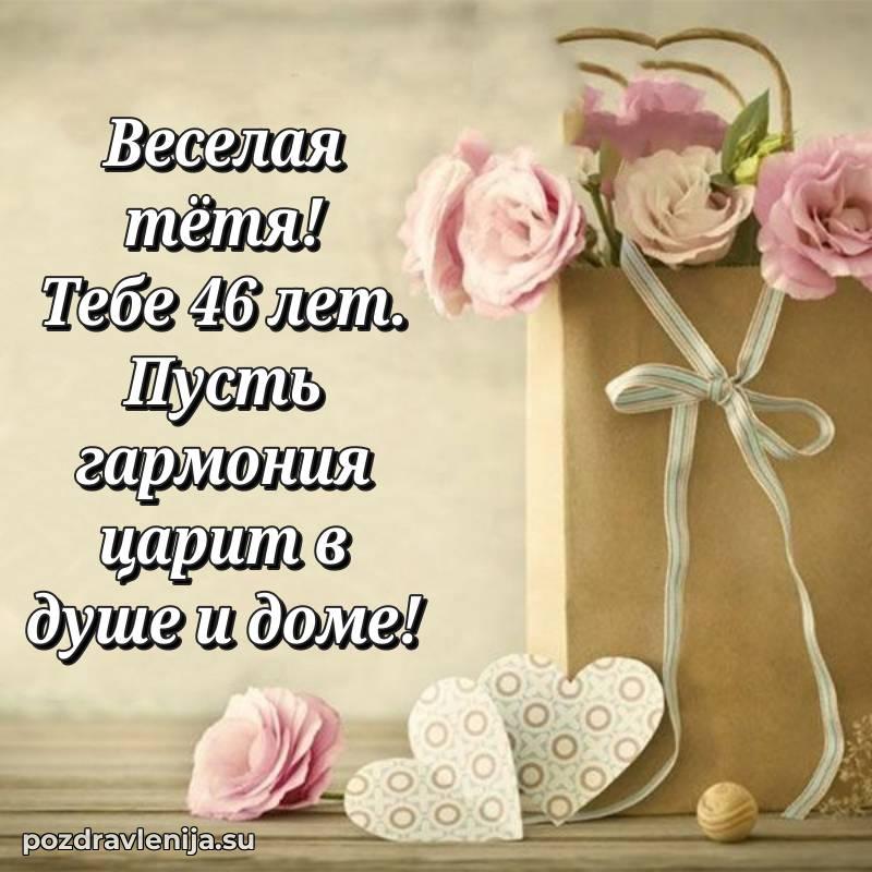 Тетя, 46 лет — время мудрости и новых свершенийПусть твоя жизнь будет наполнена светлыми моментами, любовью близких и крепким здоровьемПоздравляю и желаю всего самого лучшего!