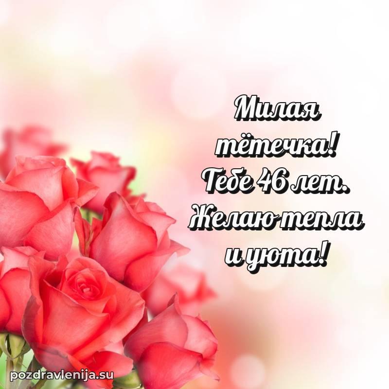 Тетя, пусть 46 лет принесет тебе новые возможности, вдохновение и радостьЖелаю тебе тепла в душе, здоровья и гармонии во всемПусть жизнь улыбается тебе каждый день!