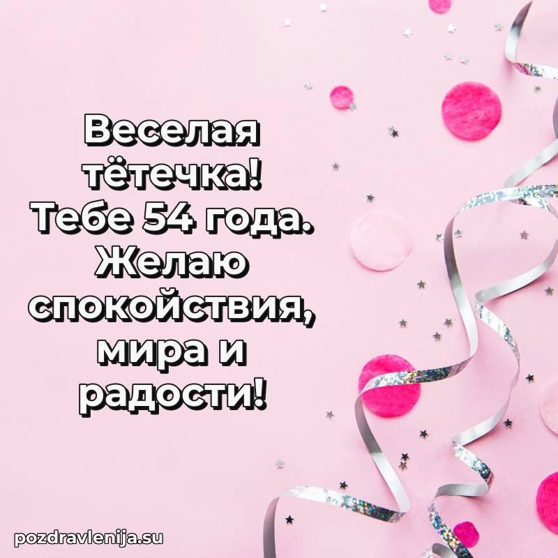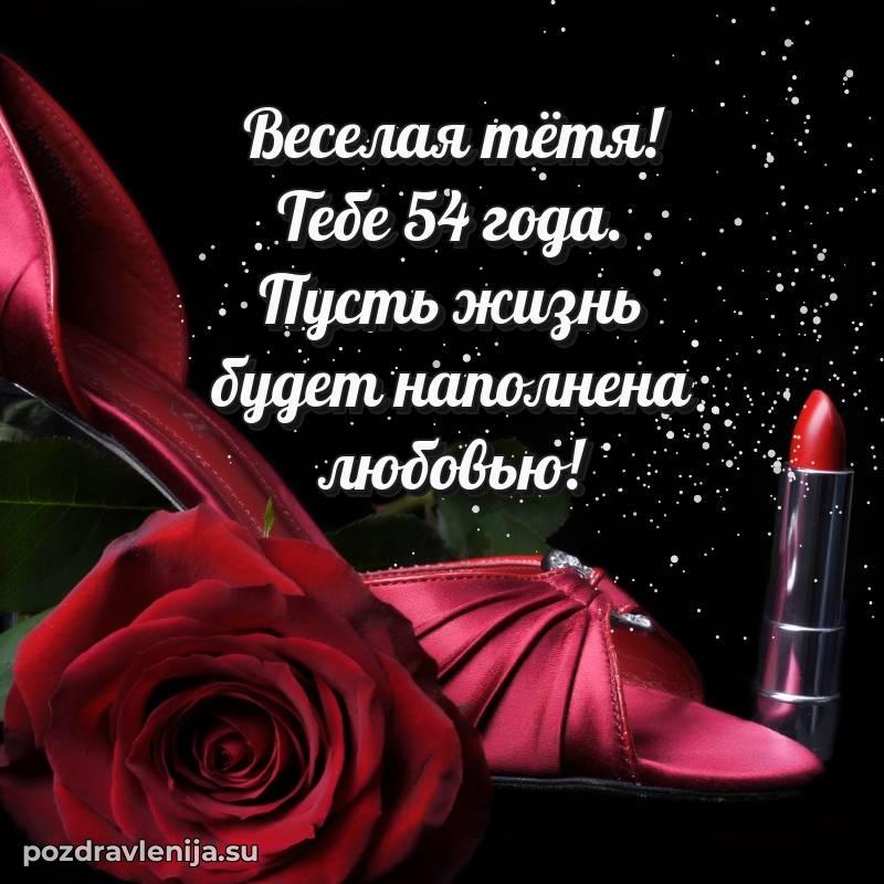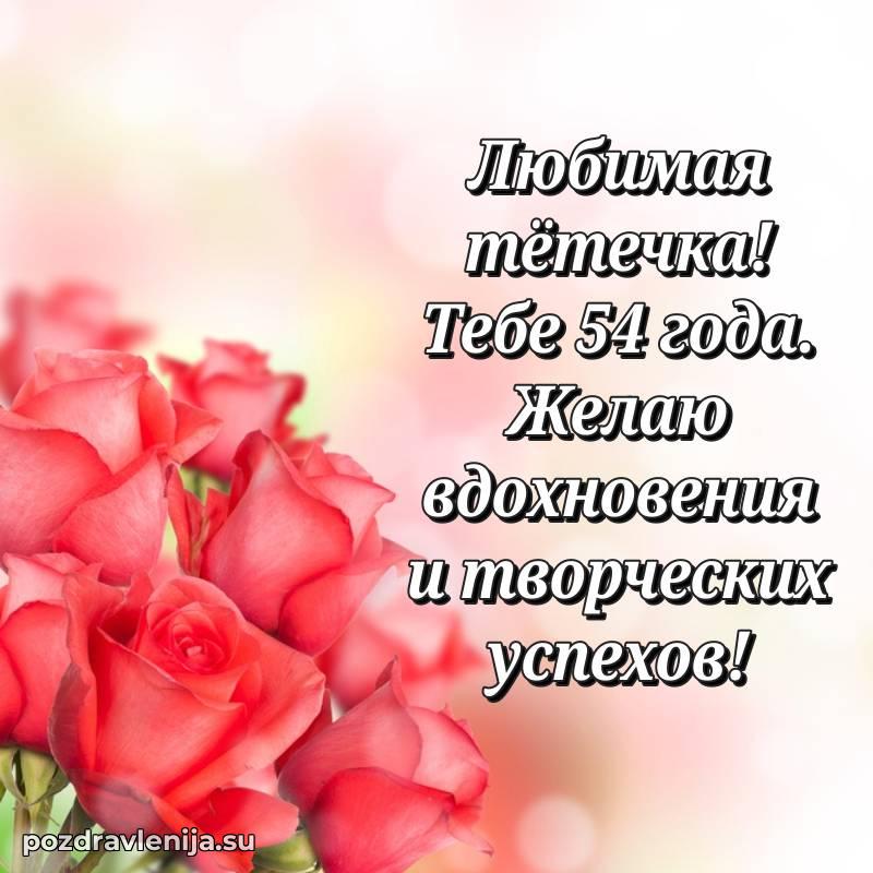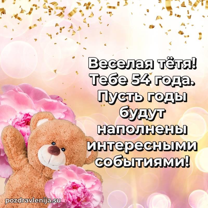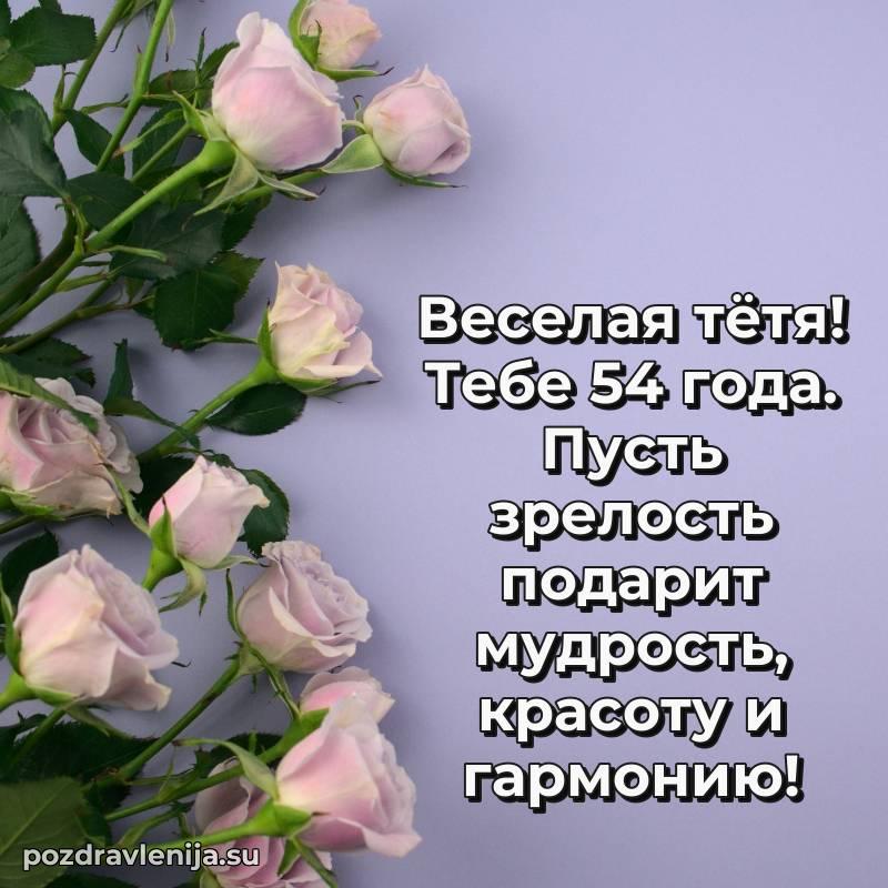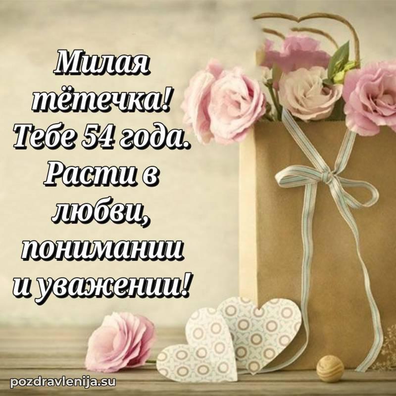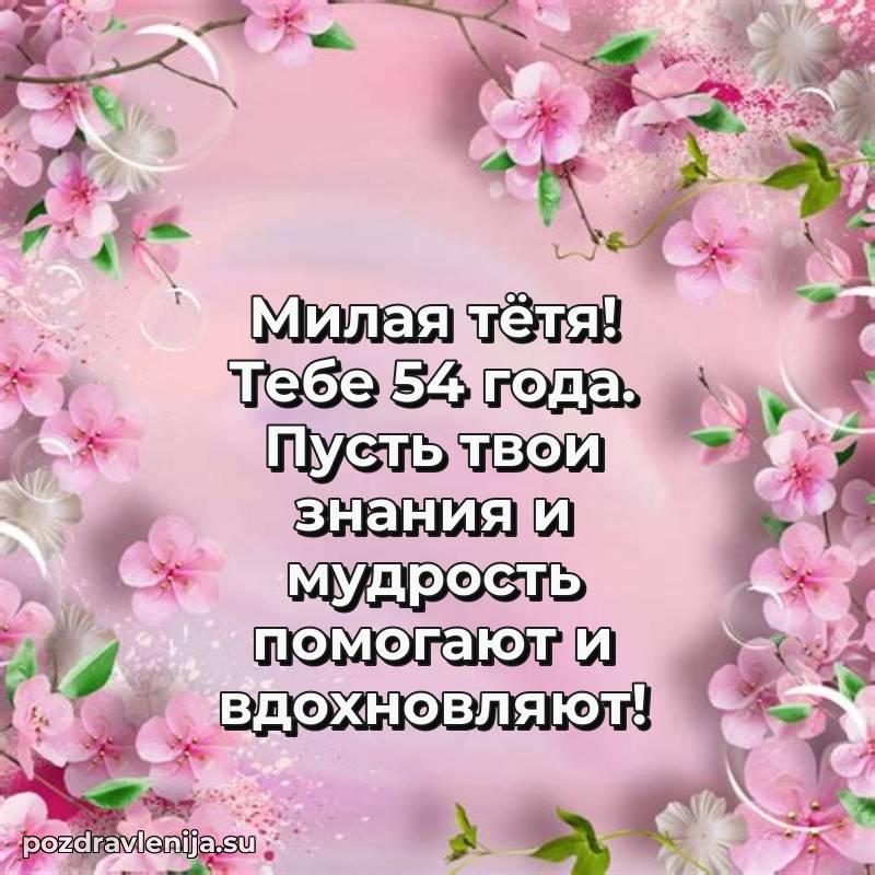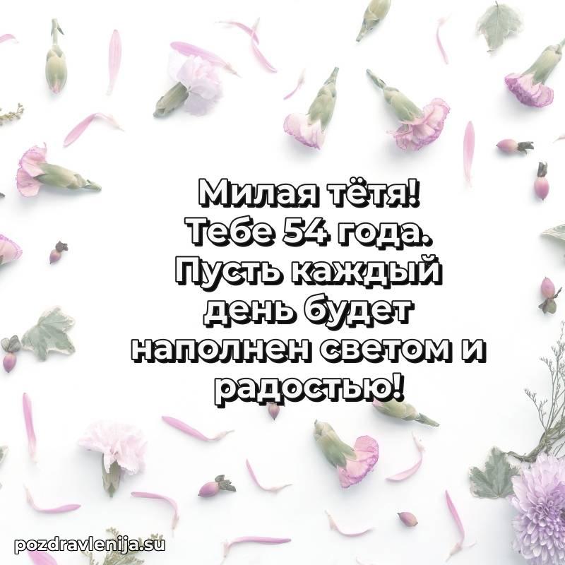 Тетя, с днем рождения Вас! Пусть здоровье будет крепким, жизнь — полной счастья, а все начинания приносят успех. Желаю Вам тепла и удачи. Пусть 54 года станут началом новых побед!