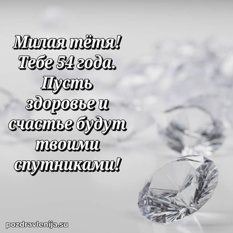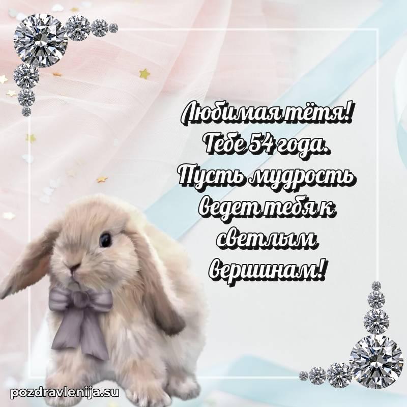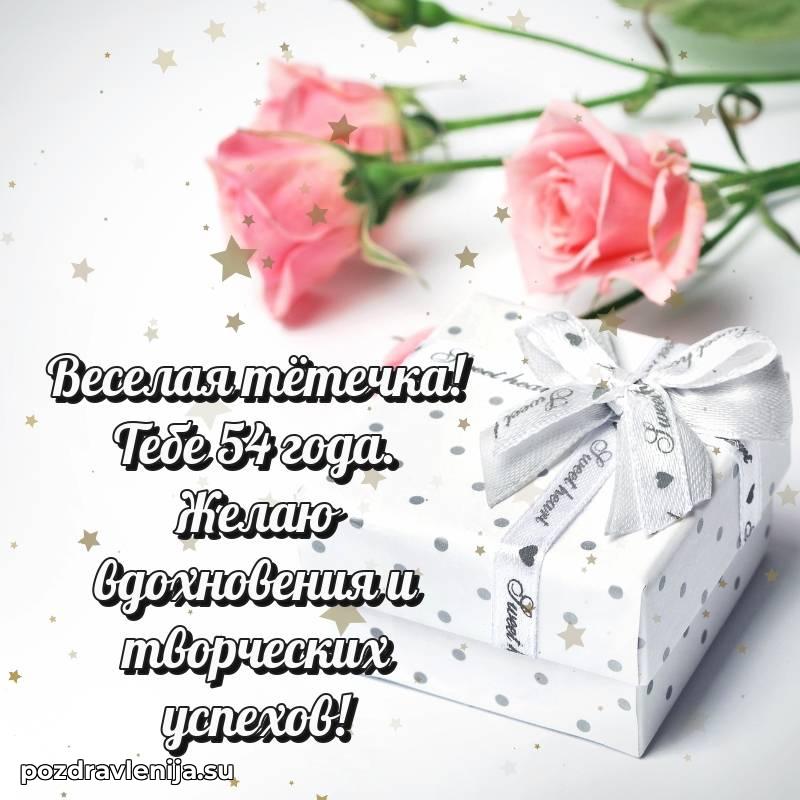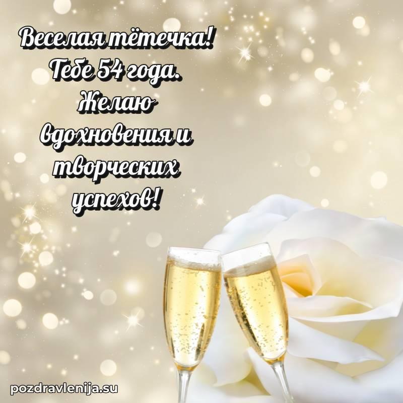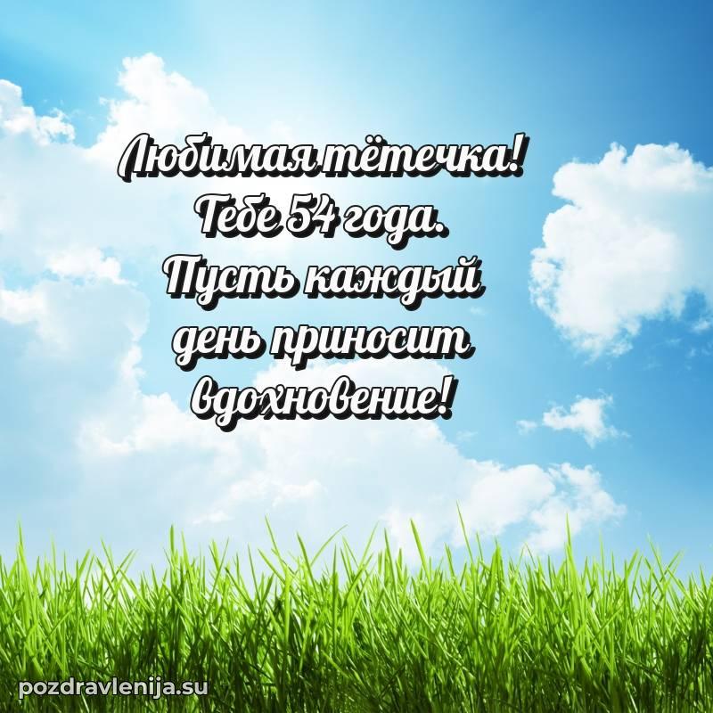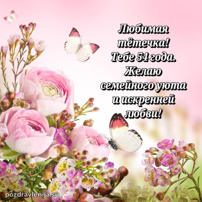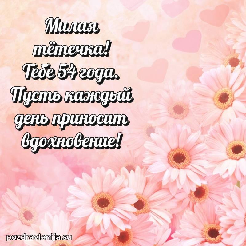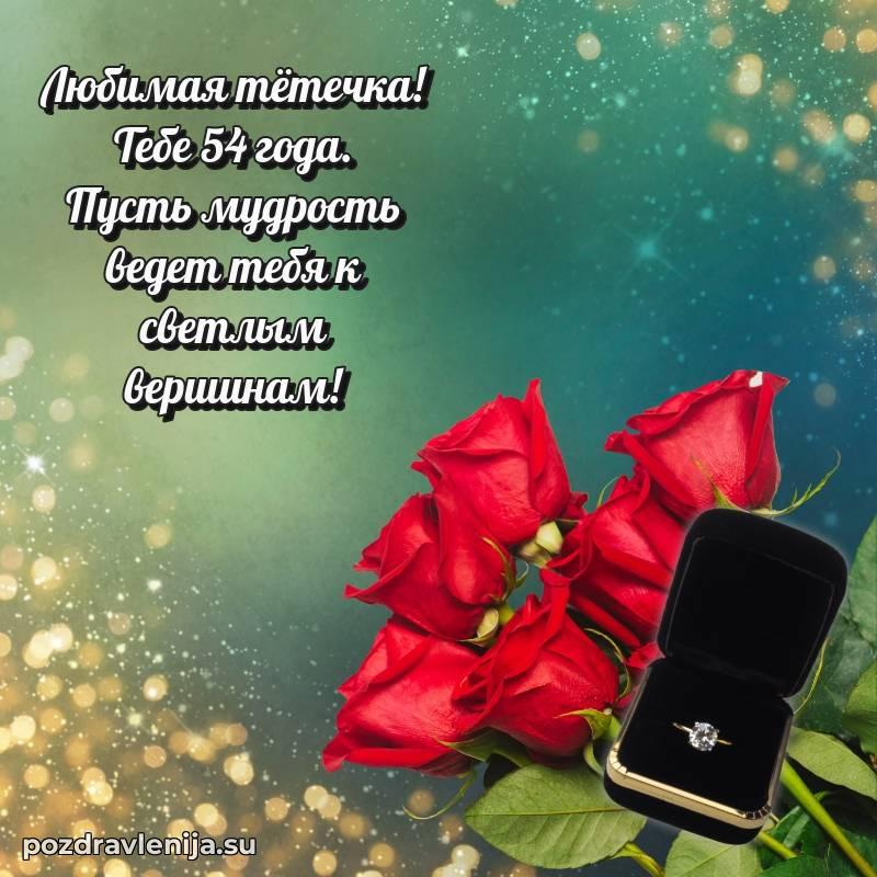 Тетя, с днем рождения Вас! Пусть здоровье будет крепким, жизнь — полной счастья, а все начинания приносят успех. Желаю Вам тепла и удачи. Пусть 54 года станут началом новых побед!