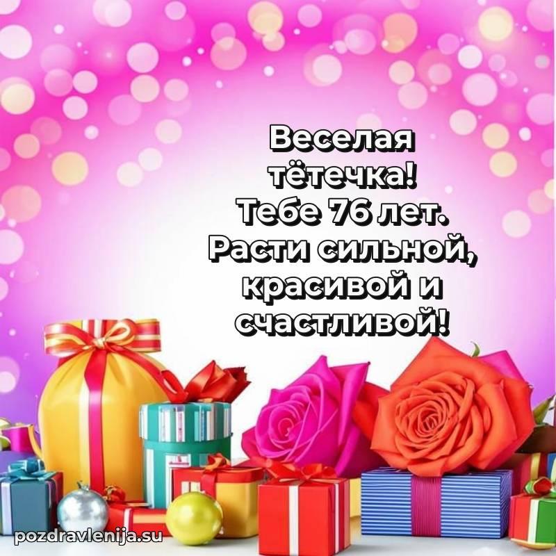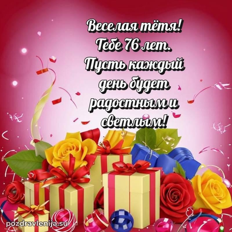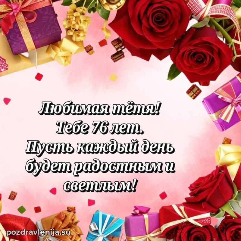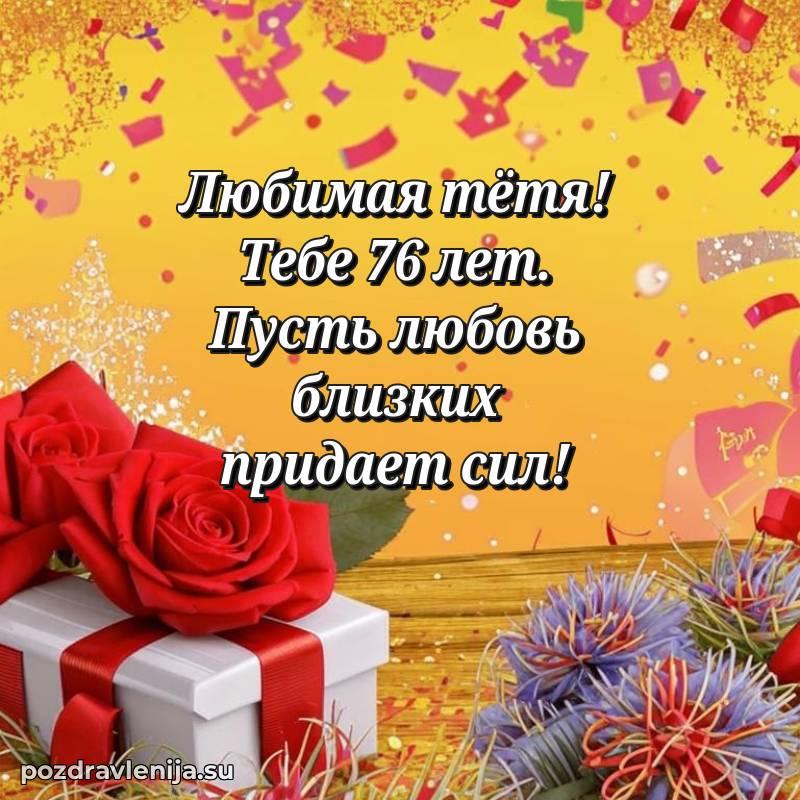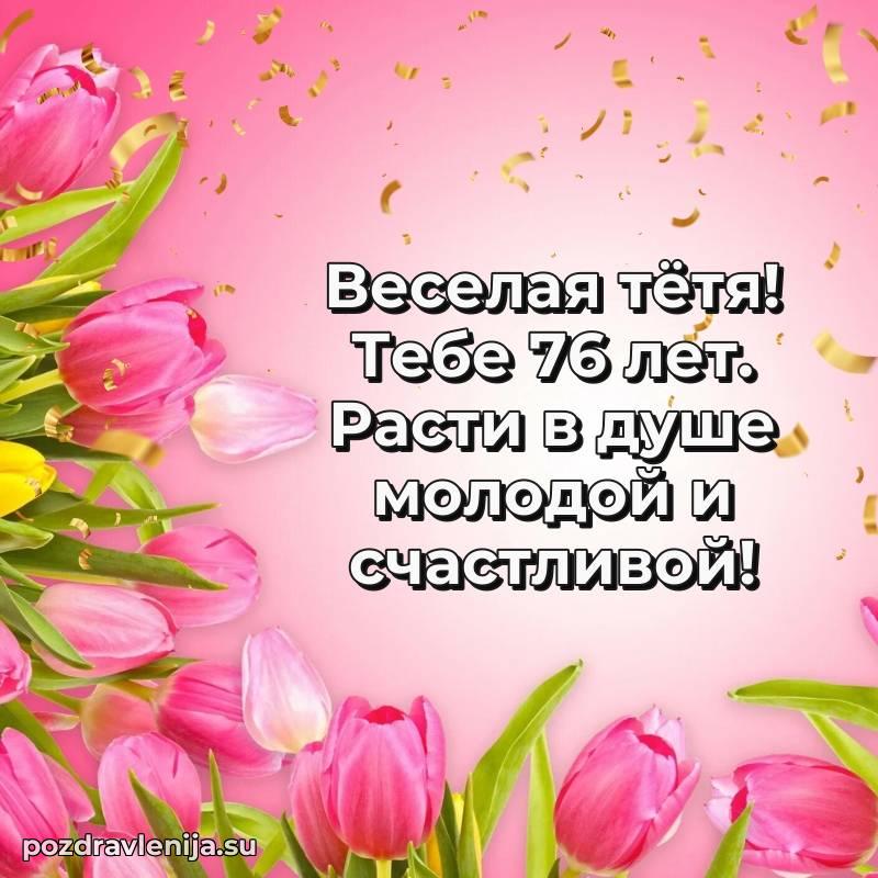 Тетя, поздравляю Вас с днем рождения! Желаю крепкого здоровья, счастья и благополучия. Пусть каждый день приносит радость, а рядом будут только любящие люди. Пусть 76 лет станут началом новых светлых страниц в жизни!