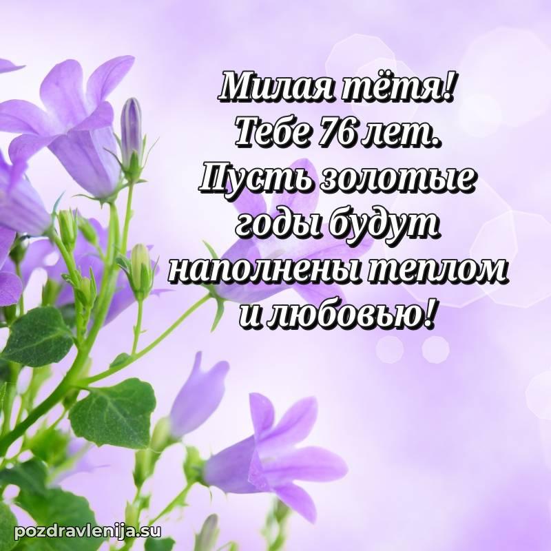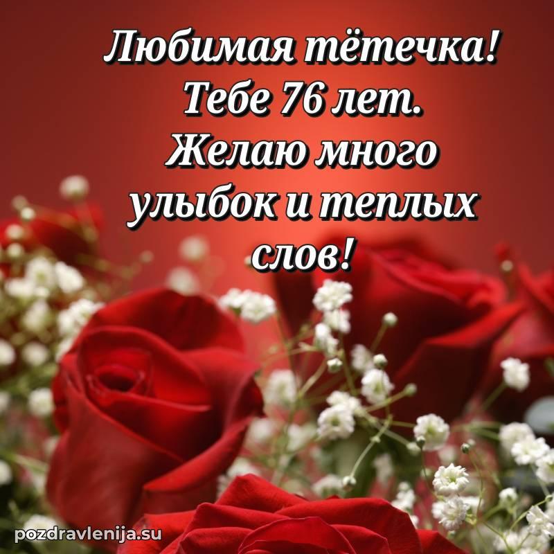 Тетя, поздравляю Вас с днем рождения! Пусть каждый день приносит только хорошее, здоровье не подводит, а в семье царит уют. Желаю Вам удачи. Пусть 76 лет будут полны энергии!