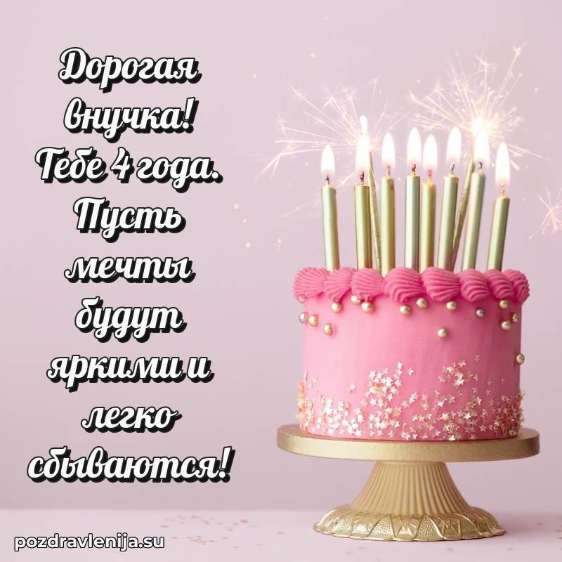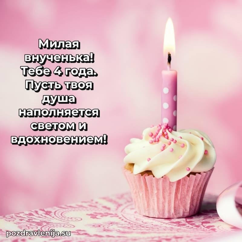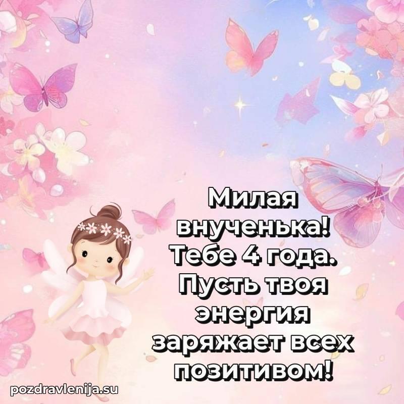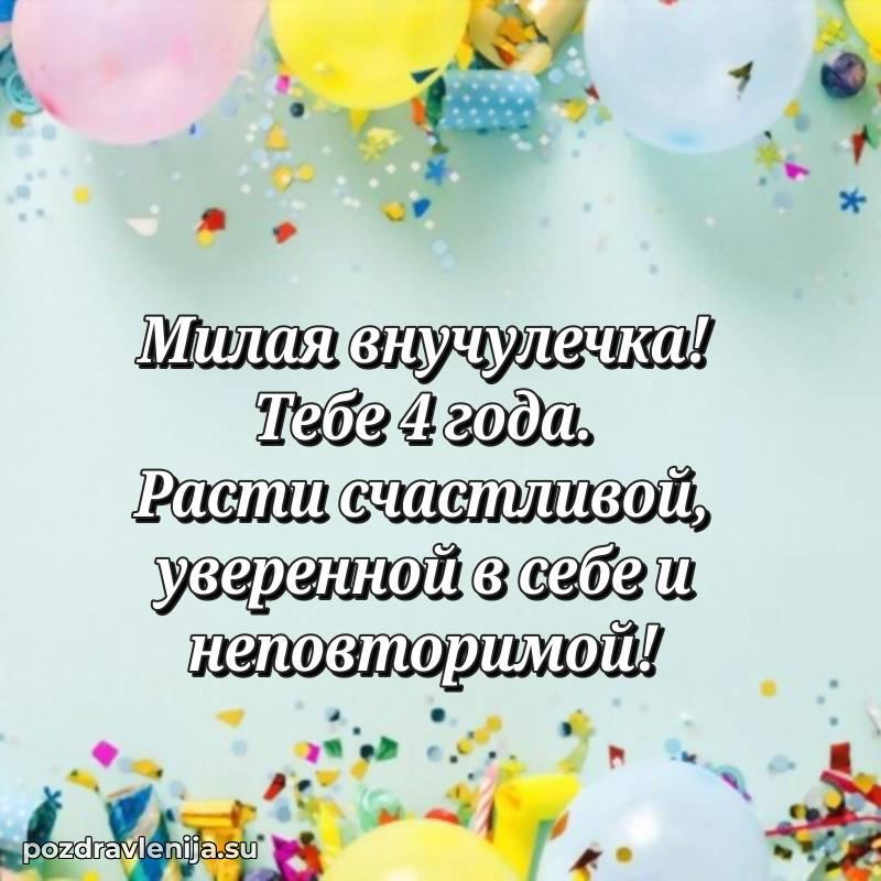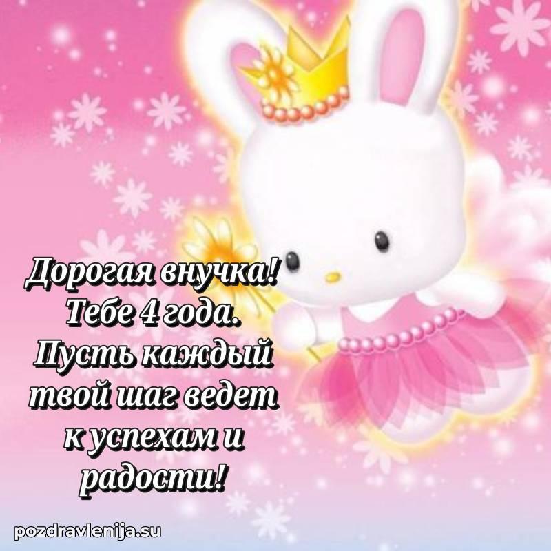 Милая внученька! В этот особенный день 4 года получает самые искренние пожелания! Расти здоровой, умной и счастливой! Пусть твои глаза всегда светятся от счастья!