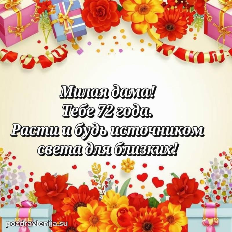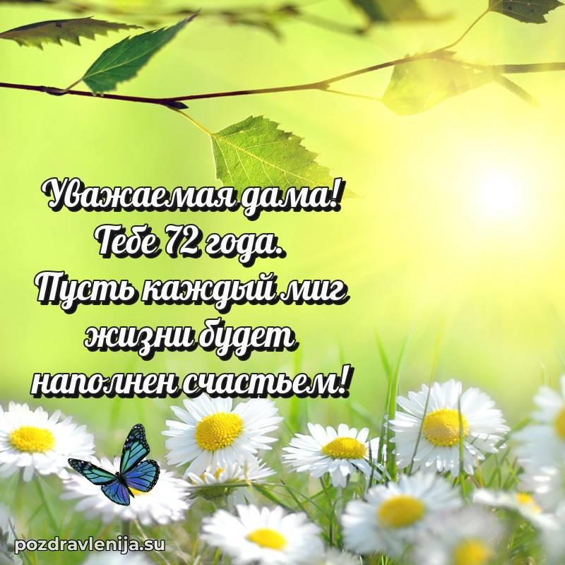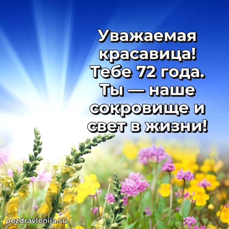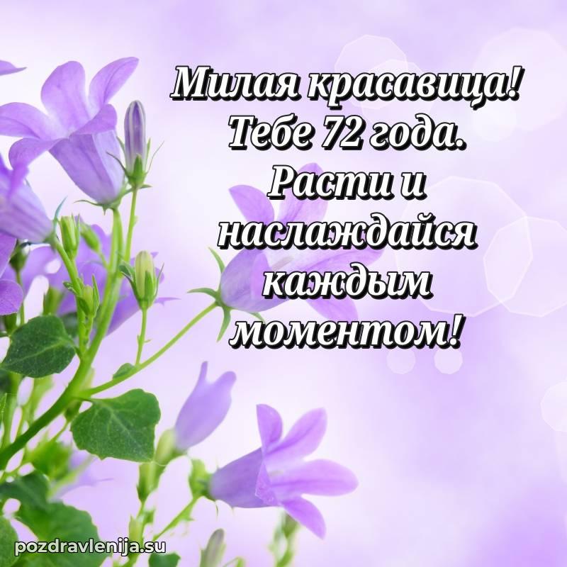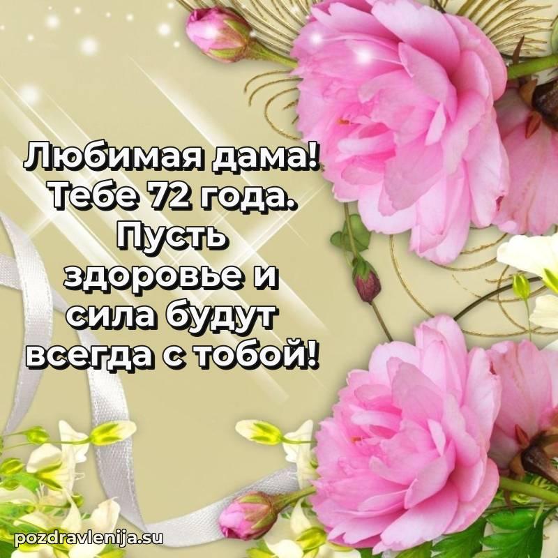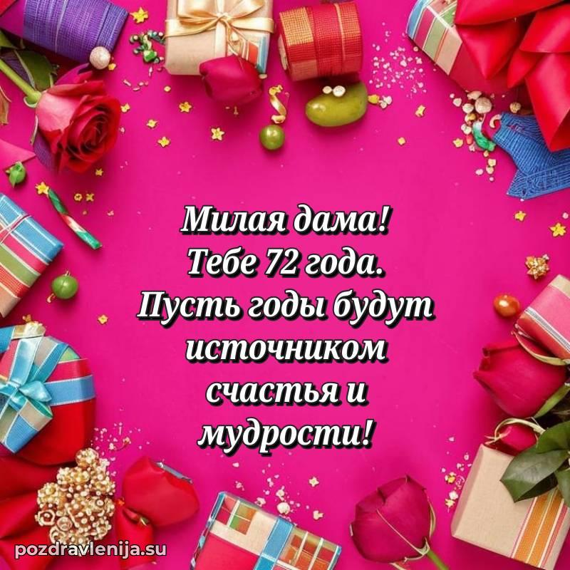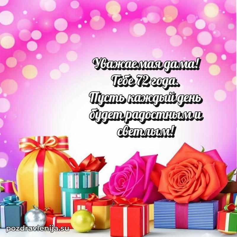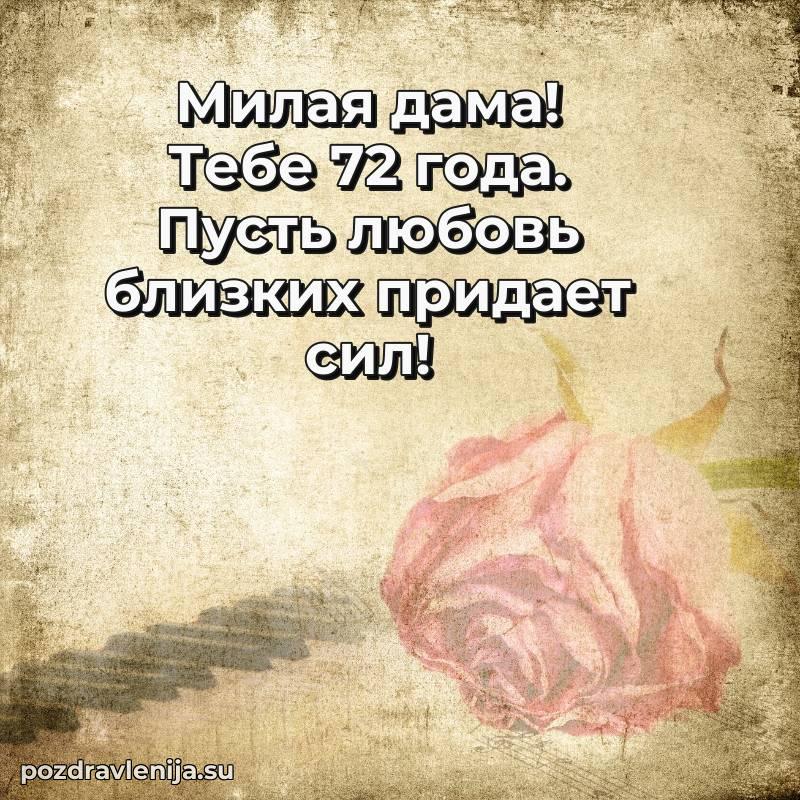 С днем рождения! 72 года — прекрасный этап жизни, полный мудрости и жизненного опыта. Пусть ваши мечты реализуются легко и красиво.