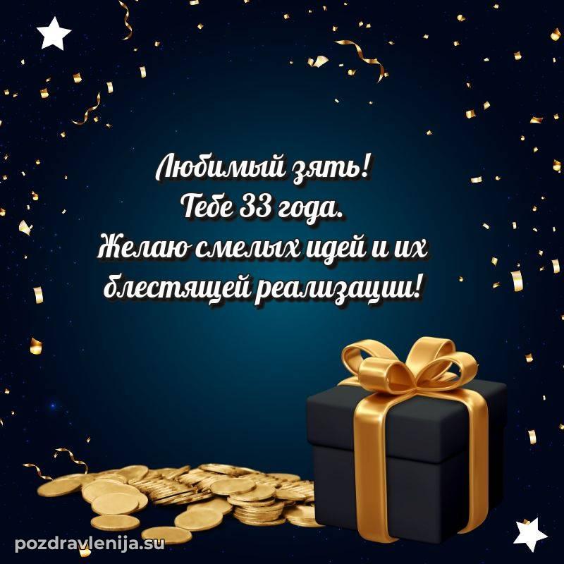 Зять, с днем рождения! Пусть каждый новый день приносит радость, здоровье остается крепким, а в жизни будет больше светлых событий. Желаю тебе удачи и гармонии. Пусть 33 года принесут тебе счастье!