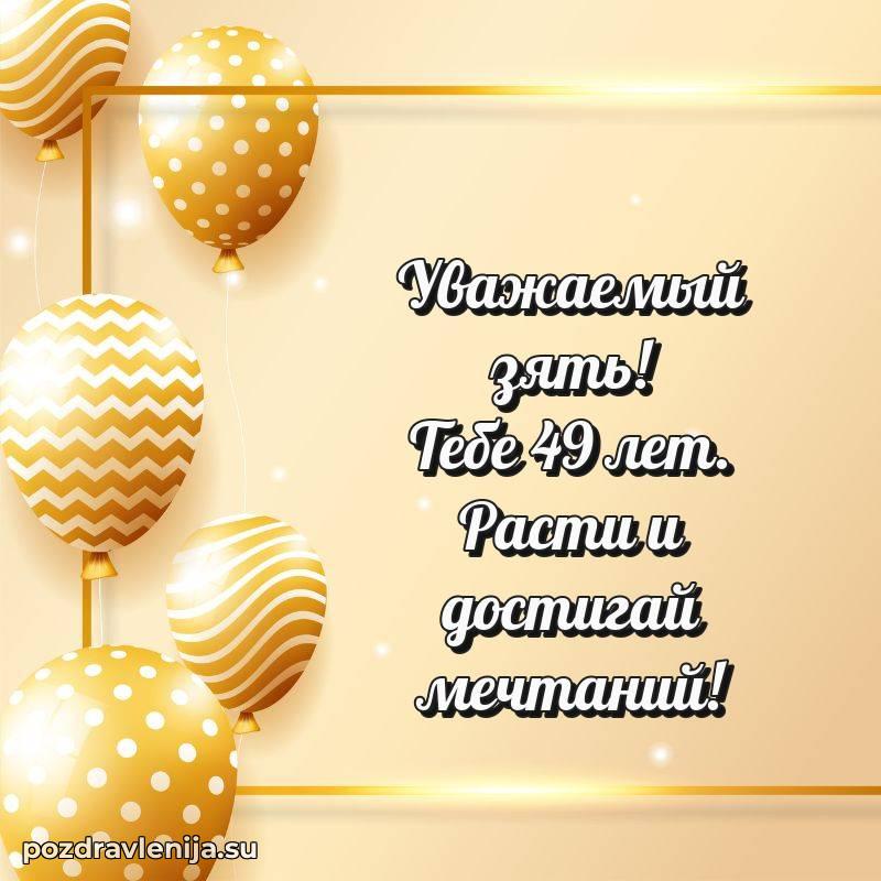 Зять, с днём рождения тебя! В твои 49 лет ты показал себя как надёжный человек. Желаем тебе крепости духа, здоровья на долгие годы и успехов во всех начинаниях. Пусть твой дом будет полон смеха, а сердце – тепла. Мы ценим тебя!